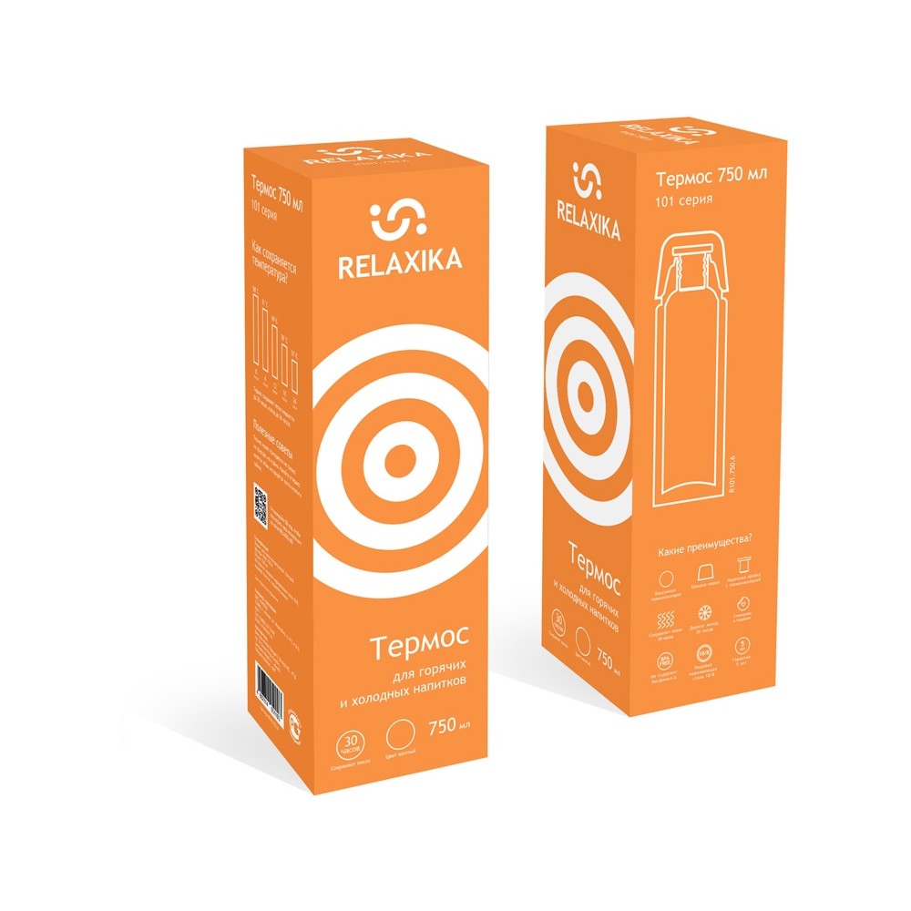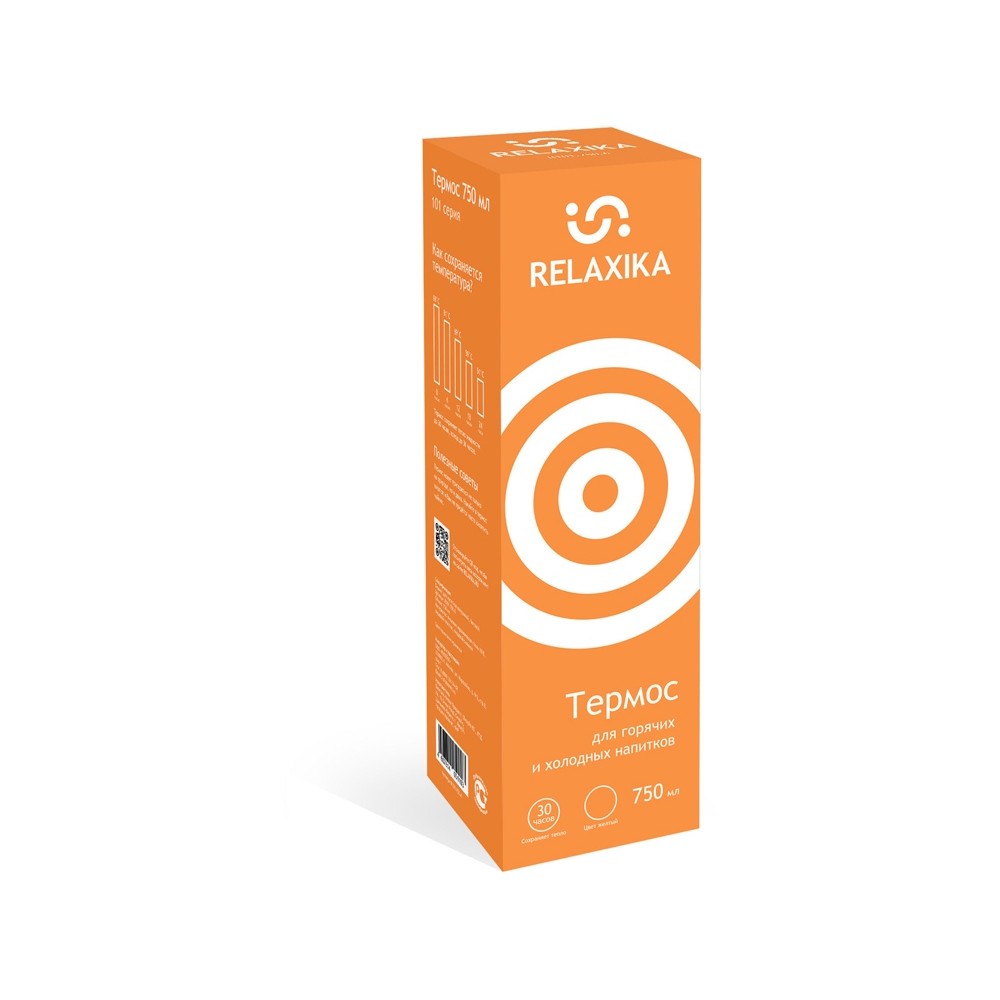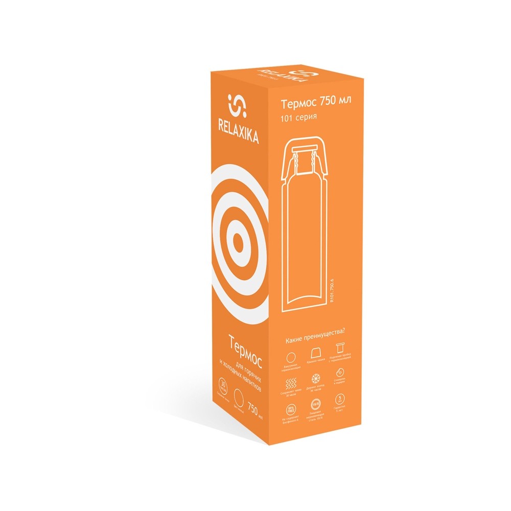 Классический термос Relaxika с высокими показателями удержания температуры напитка для походов, путешествий, спорта и ежедневного использования. Прочные двойные стенки из высококачественной нержавеющей стали 18/8 с вакуумной изоляцией гарантируют, что ваш напиток останется холодным в течение 36 часов и горячим до 30 часов. Этот материал не только прочен, но и гигиеничен, не выделяет никаких вредных для здоровья веществ. Ваши напитки сохраняет естественный вкус и не приобретут посторонний запах. Напиток остается холодным до 36 часов и горячим до 30 часов.