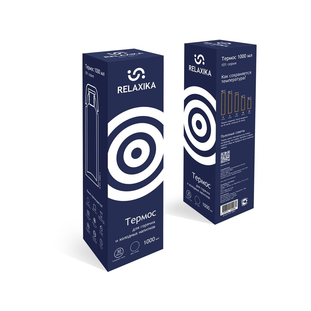 Классический термос Relaxika черного цвета с высокими показателями удержания температуры напитка для походов, путешествий, спорта и ежедневного использования. Прочные двойные стенки из высококачественной нержавеющей стали 18/8 с вакуумной изоляцией гарантируют, что ваш напиток останется холодным в течение 36 часов и горячим до 30 часов. Этот материал не только прочен, но и гигиеничен, не выделяет никаких вредных для здоровья веществ. Ваши напитки сохраняет естественный вкус и не приобретут посторонний запах.