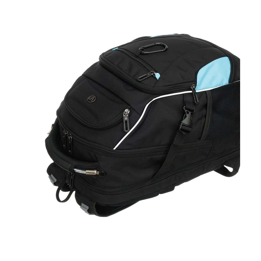 Карман для зонта или бутылок из специальной эластичной сетки подходит для ёмкостей любого размера. Объем в 34 л дает вам возможность взять с собой всё необходимое. Рюкзак выполнен в черном цвете с бирюзовыми вста
