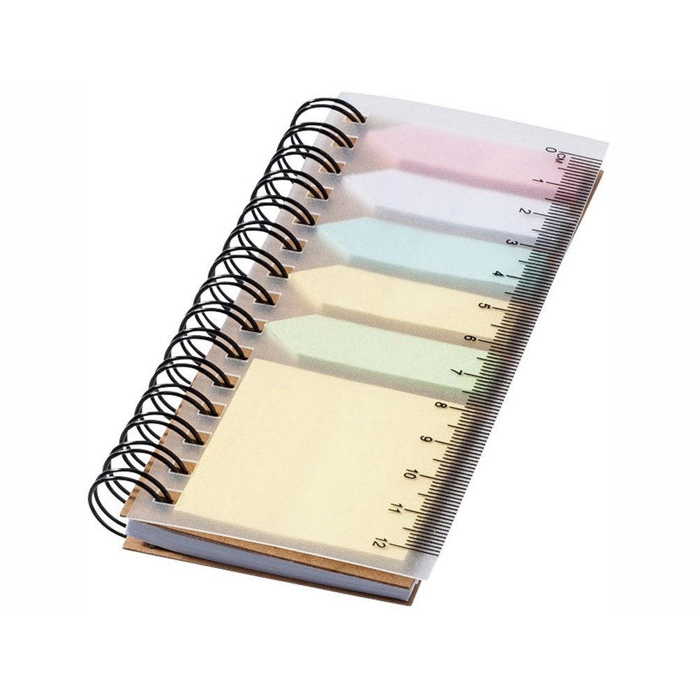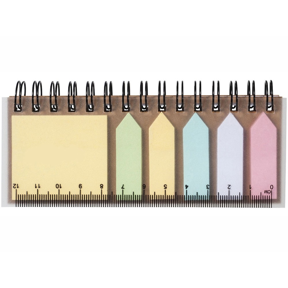 Блокнот Spiral с клейкими листами. Блокнот с 25 страницами клейких листочков 5 цветов и 40 страницами линованной белой бумаги. Включает линейку на передней обложке. ПП-пластик.