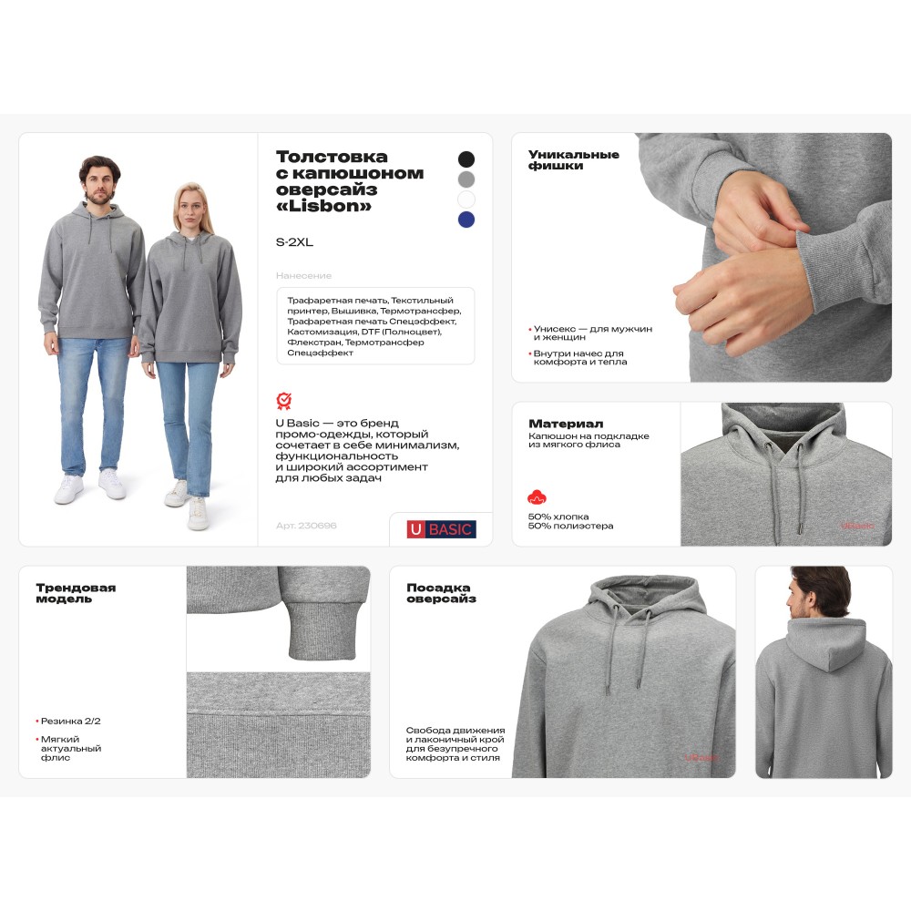 На складе Код товара: 230696S Толстовка с капюшоном оверсайз «Lisbon» унисекс, серый меланж