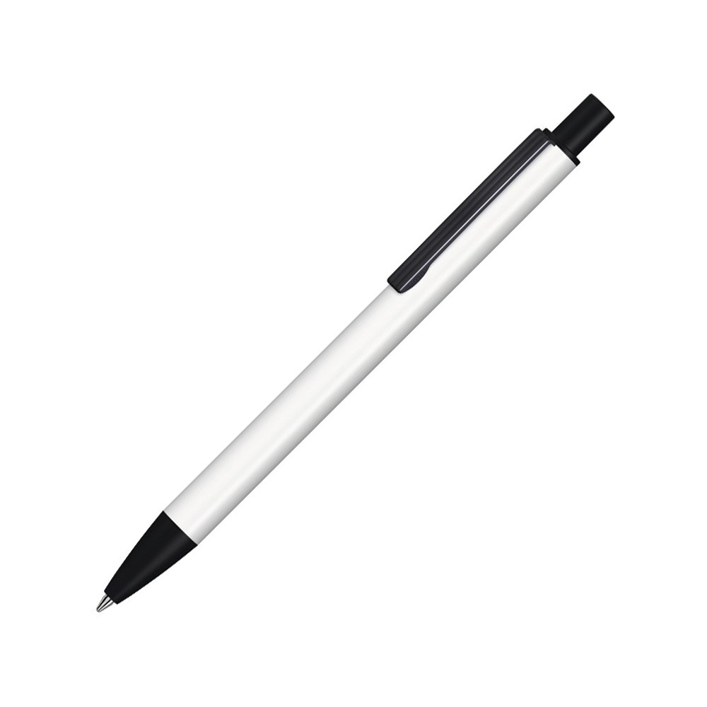 Автоматическая шариковая ручка с матовым тонированным черным корпусом и цветным наконечником, широким изогнутым клипом.