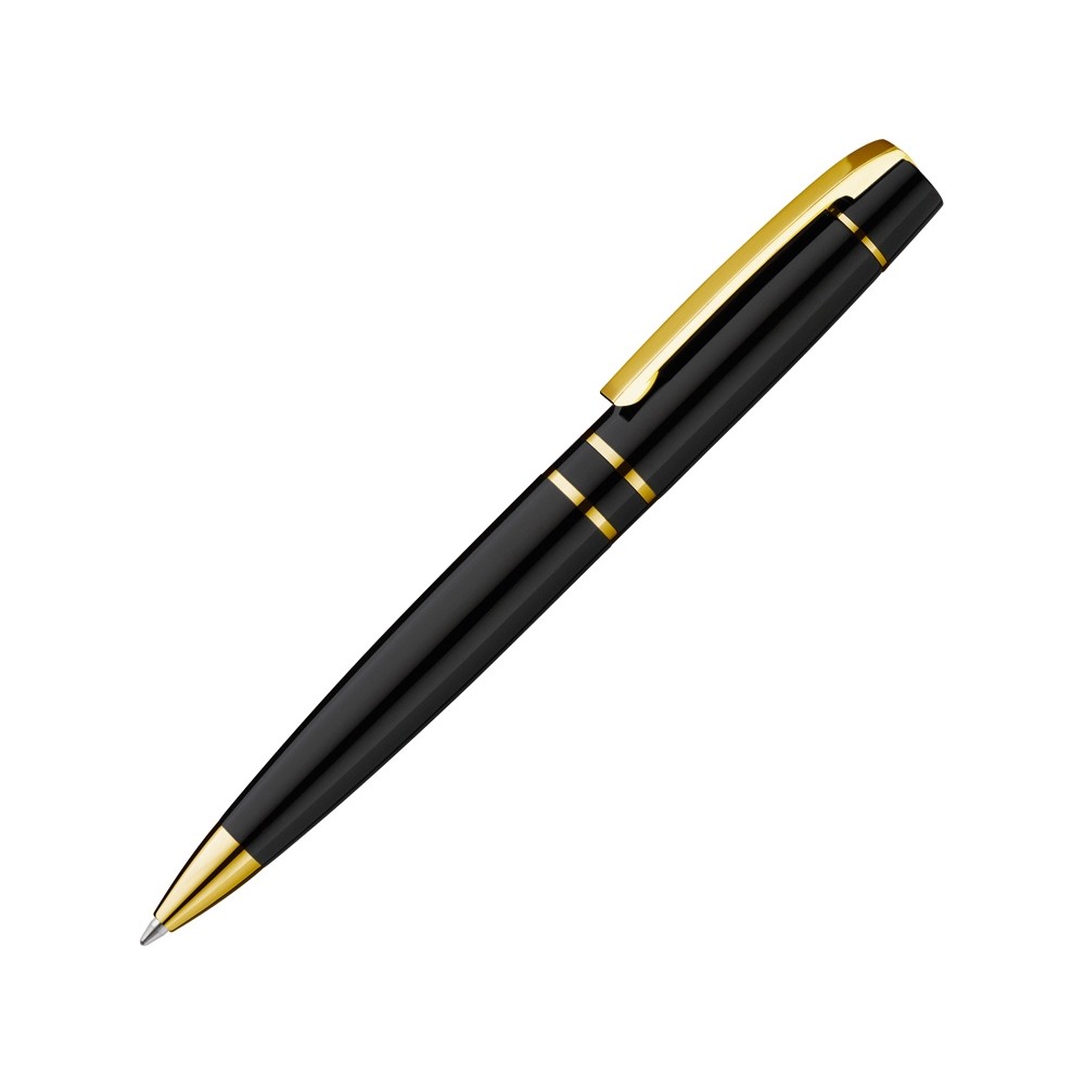 Металлическая шариковая ручка с поворотным механизмом и пружинным клипом. Фурнитура с позолоченной отделкой.