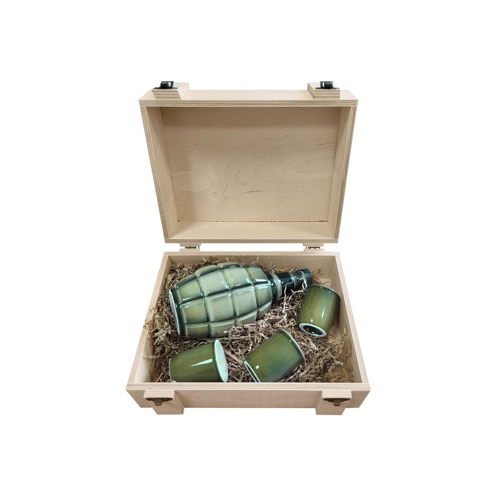 День Победы - один из самых важных и памятных государственных праздников в нашей стране. В этот знаковый для России день принято дарить памятные сувениры. Подарочный набор "День Победы" - это великолепный подарок на 9 мая, который запомнится надолго. В оригинальном деревянном “гранатном” ящике находятся керамические боеприпасы: штоф в виде гранаты и три стопки.