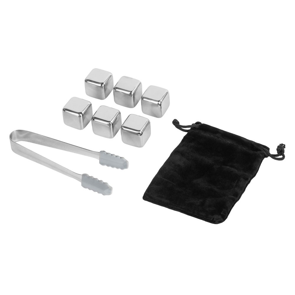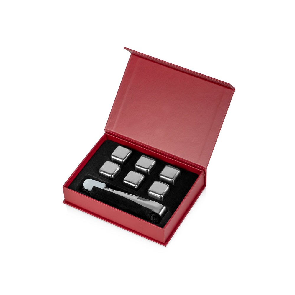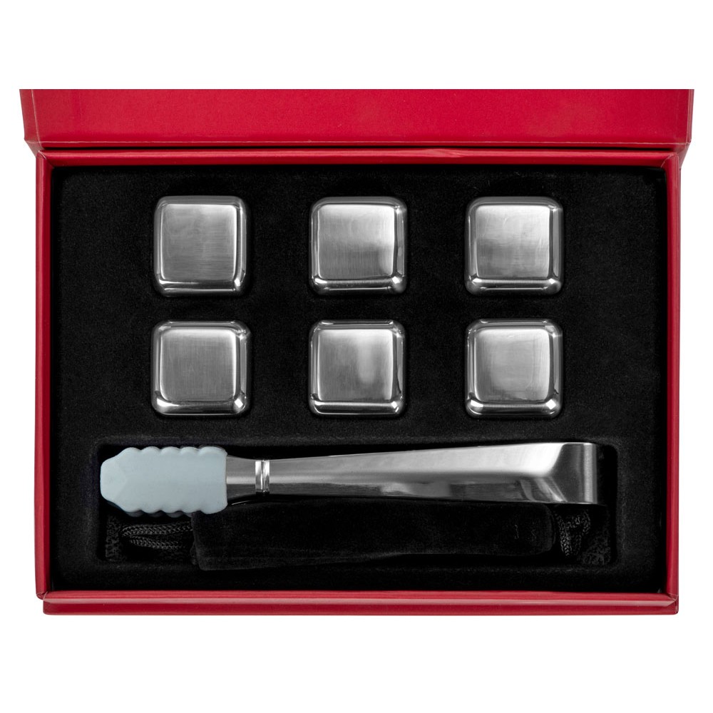 Набор для виски "Skye" состоит из шести охлаждающих камней из нержавеющей стали, бархатистого мешочка и удобных щипцов. Сет упакован в качественную коробку с магнитной крышкой винного цвета, а сверху надевается шубер с полиграфией, который можно заменить на какой-либо другой.