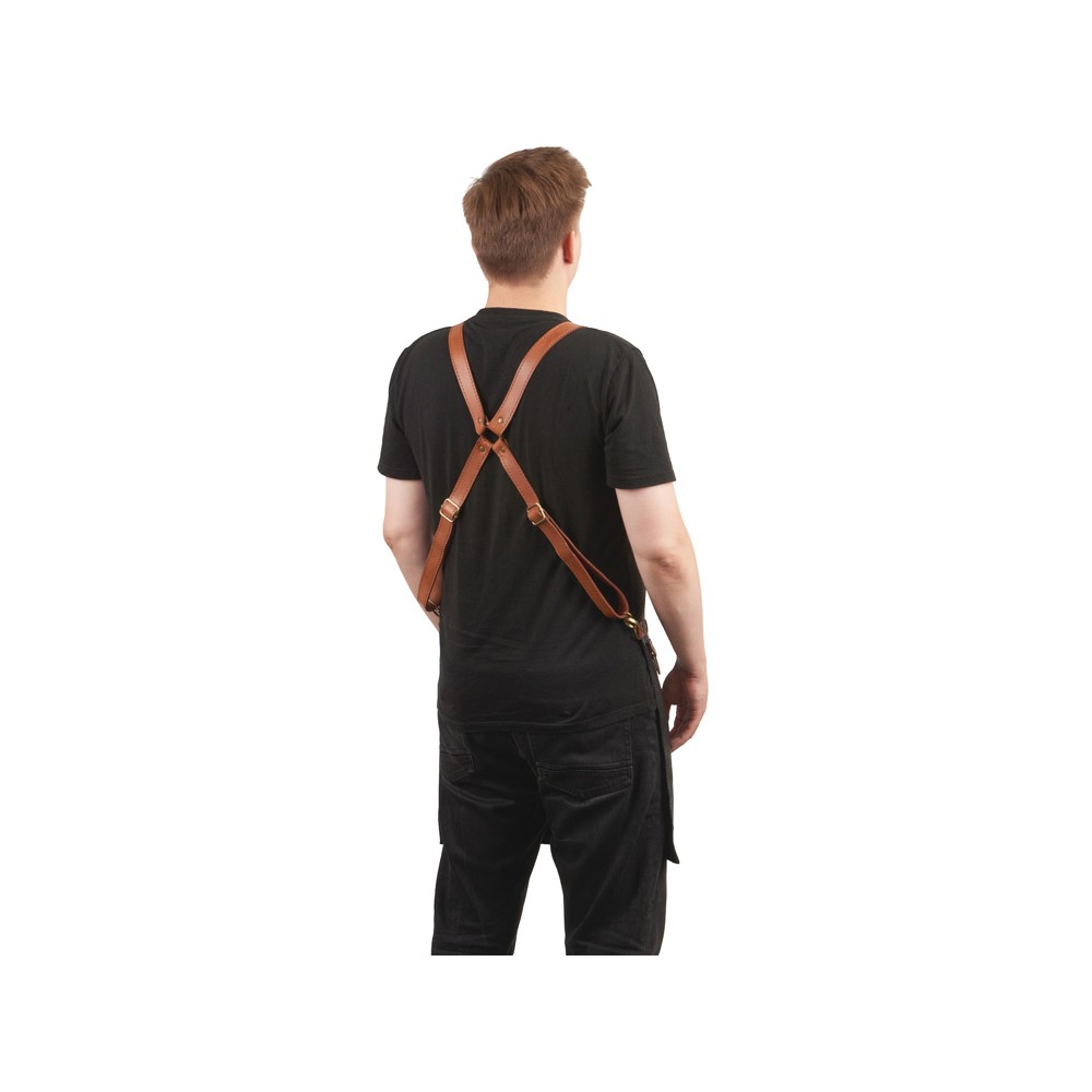 - Стильные акценты: Ремни светлого бука не только удобно фиксируют фартук, но и добавляют контраста черному цвету, делая его настоящим модным заявлением.