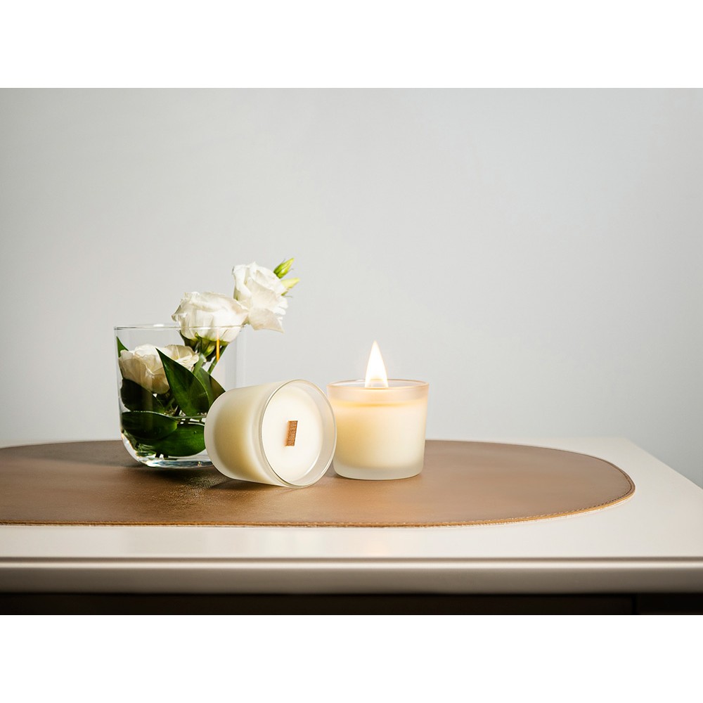 Ароматпачули, табак, маракуйя, сандал, амбра Вес560 Материал товарасоевый воск (США), ароматическая композиция (Франция), стакан для свечи (стекло)