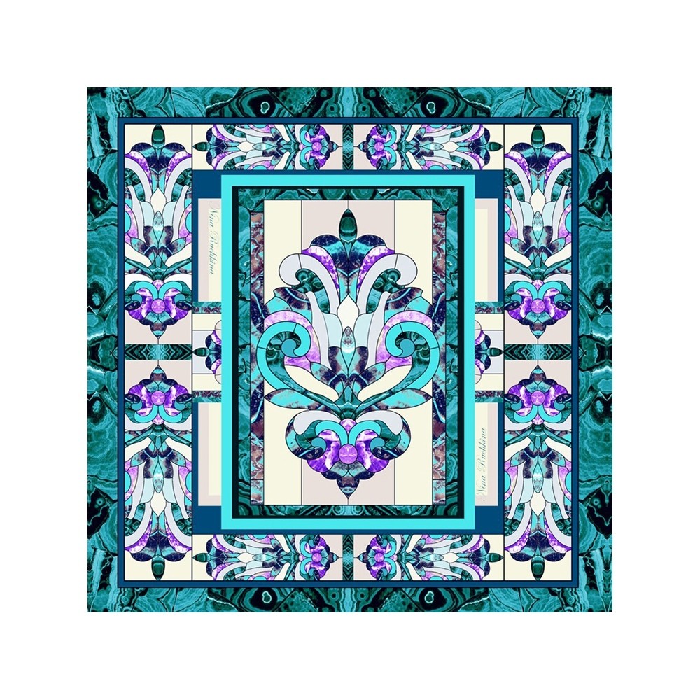 Платок «Каменный цветок» открывает сокровищницу садов Хозяйки Медной горы. Заглавный образ навеян сказом о Каменном Цветке – символе творческого поиска и совершенства. Мозаика цветка содержит уральские самоцветные кристаллы аметиста и медного изумруда в обрамлении каймы узорчатого малахита.