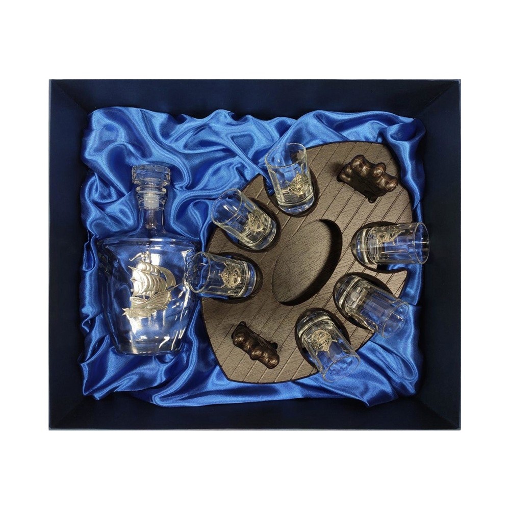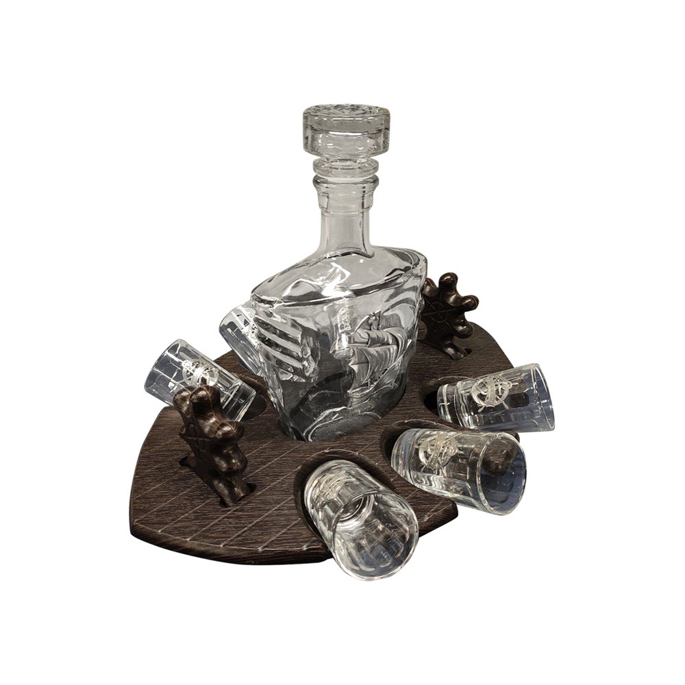 Набор для водки со штофом. В набор входит штоф 0.5 л с оловянным барельефом, шесть стопок 60 мл с оловянным барельефом и подставка мини-бар в форме корабля.