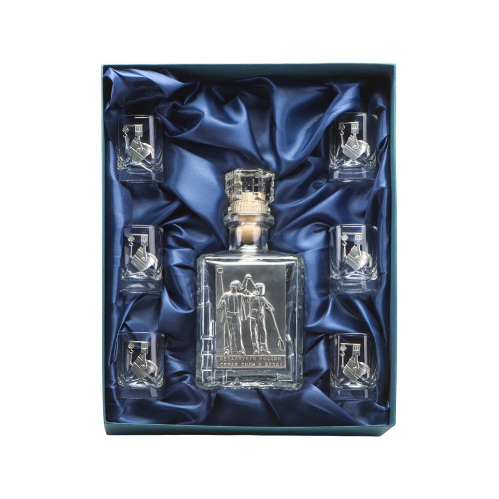 Набор для водки со штофом «Металлургический» - это отличный VIP-подарок для представителей металлургической отрасли. Подарок упакован в стильную подарочную упаковку, а сохранность набора гарантирует шелковый ложемент, который приятно оттеняет литье.