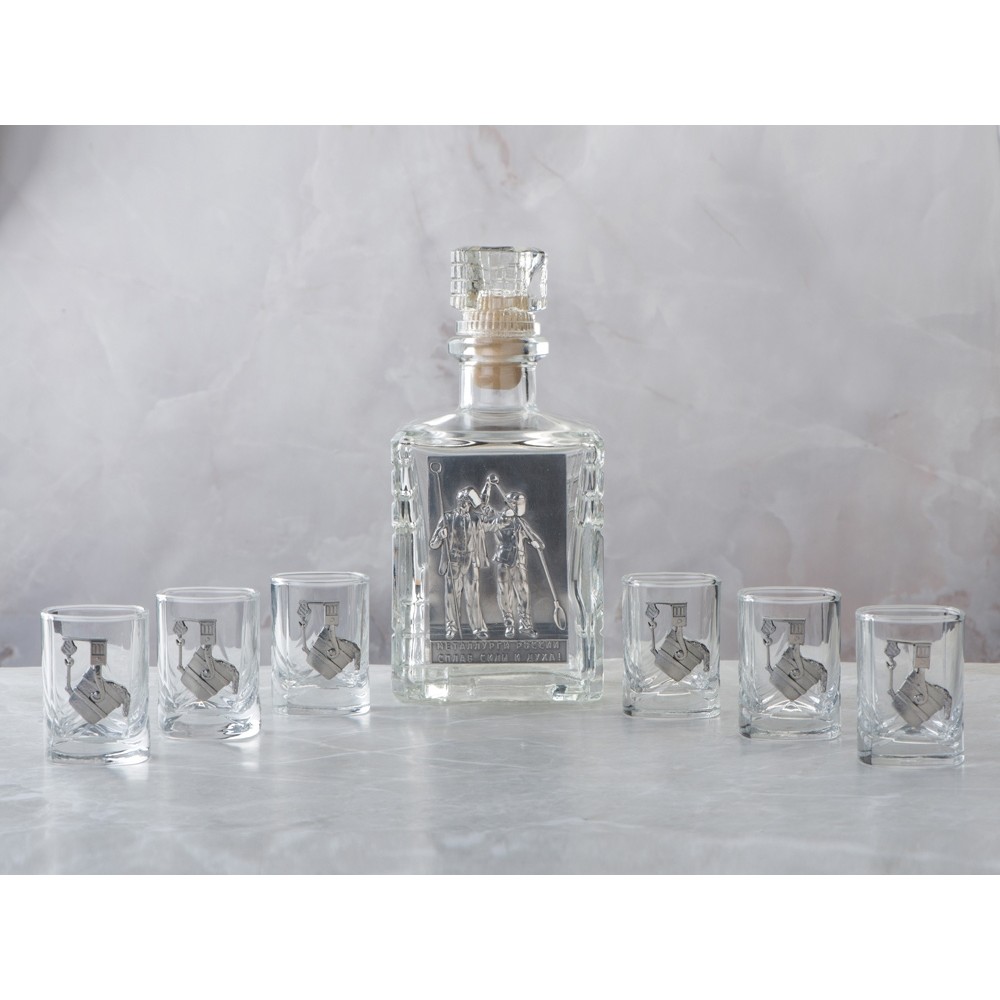 Для представителей настоящих мужских профессий и подарок должен быть соответствующий. Наш штоф, с набором рюмок, украшенный художественным литьем с эффектом антикварного серебра, является именно таким дорогим презентом.