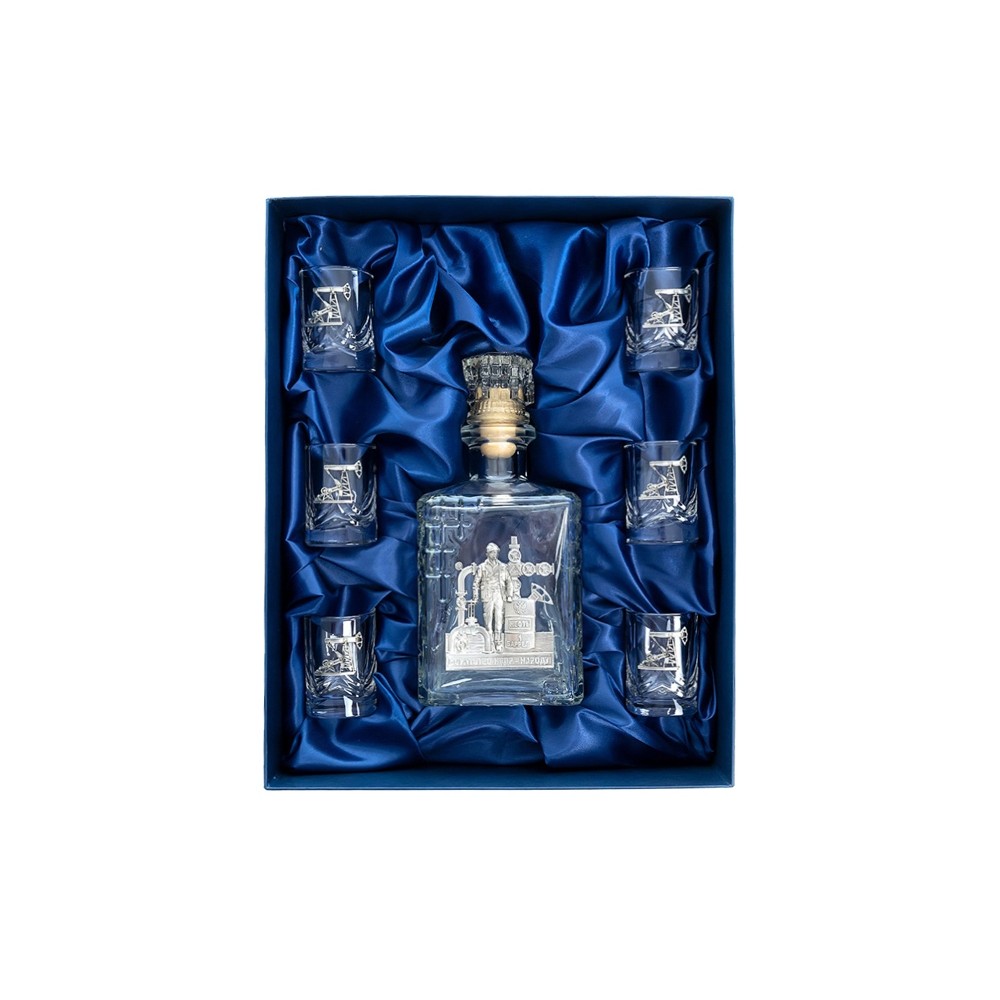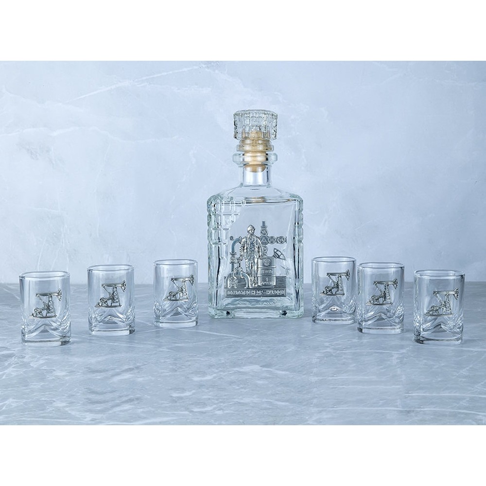 Подарочный набор со штофом «Нефтяной». Традиционная для русского человека комплектация: элегантный графин емкостью 750 мл. с оловянным барельефом «Нефтяник» и 6 стопок емкостью 50 мл. с оловянным барельефом «Нефтяная вышка». Материал барельефов: сплав с содержанием олова не менее 95%(пьютер). Художественное литье,чернение с эффектом антикварного серебра, полировка. Ручная работа. Подарочная упаковка «люкс» с атласным ложементом.