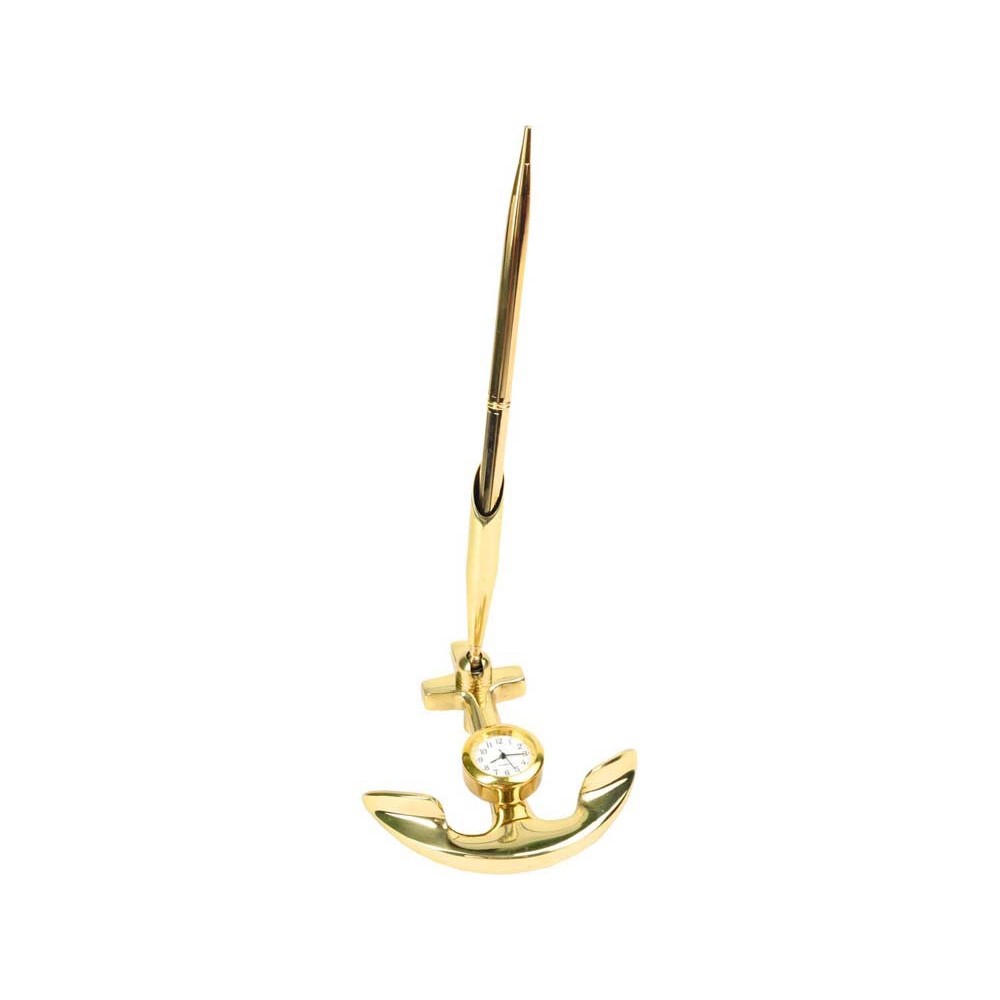 Небольшой настольный прибор в форме якоря оборудован подставкой для ручки и часами. Прибор сделан из латуни и обладает стильной золотистой расцветкой. Прибор идеально подойдет в качестве подарка представителям судоходных компаний, а также любителям рыбалки и моря.