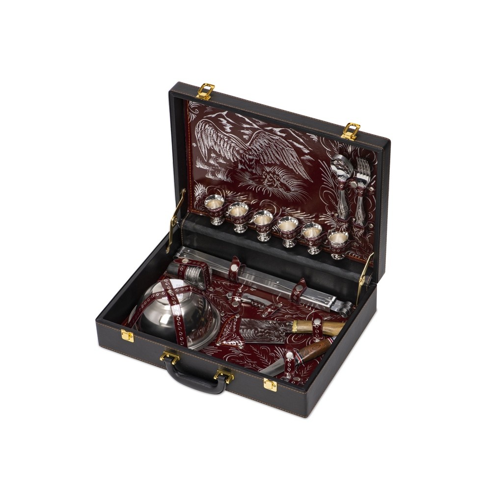 Комплектность зажигалка, нож, нож "Тяпка", нож сомелье, тарелка- 6шт, стопка- 6шт, шампур- 6шт, стопка с узором- 6шт, ложка- 6шт, вилка- 6шт