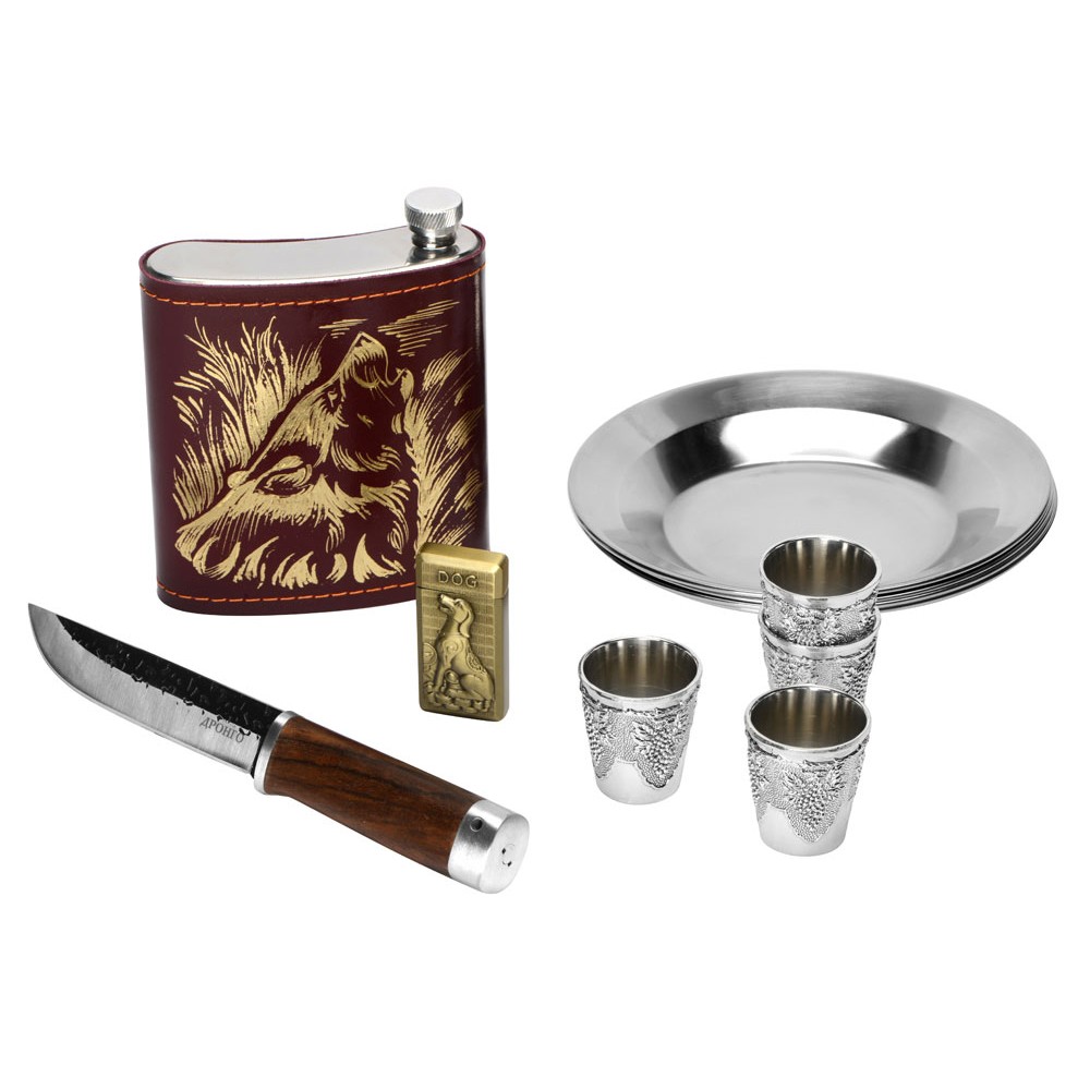 Комплектность тарелка d18,3 х 2,5 см - 4шт, нож 23,5 х 3 х 2,3 см, зажигалка 3,3 х 6,7 х 1,2 см, стопка d4,3 х 4,9 см - 4шт, фляга 12,7 х 16 х 4 см