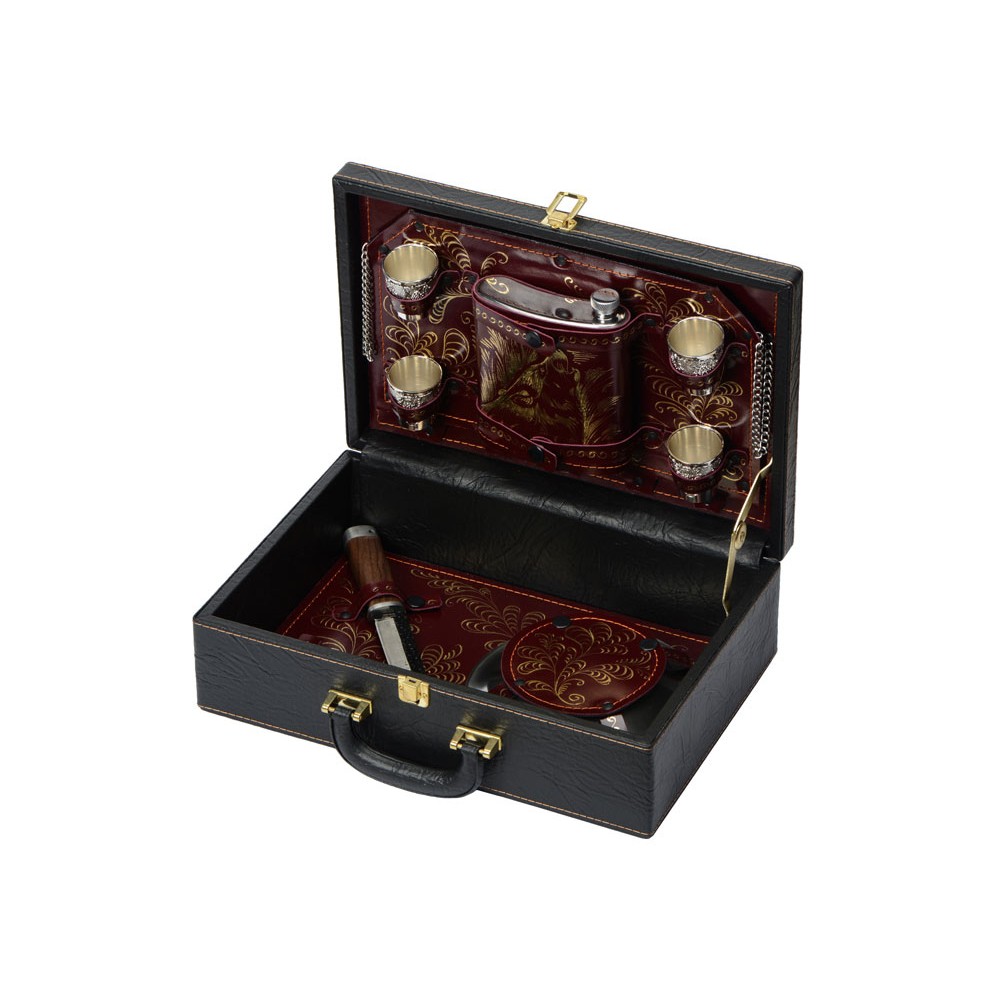 Вес3600 Комплектностьтарелка d18,3 х 2,5 см - 4шт, нож 23,5 х 3 х 2,3 см, зажигалка 3,3 х 6,7 х 1,2 см, стопка d4,3 х 4,9 см - 4шт, фляга 12,7 х 16 х 4 см Материал товарасплит-кожа/натуральная кожа, нержавеющая сталь