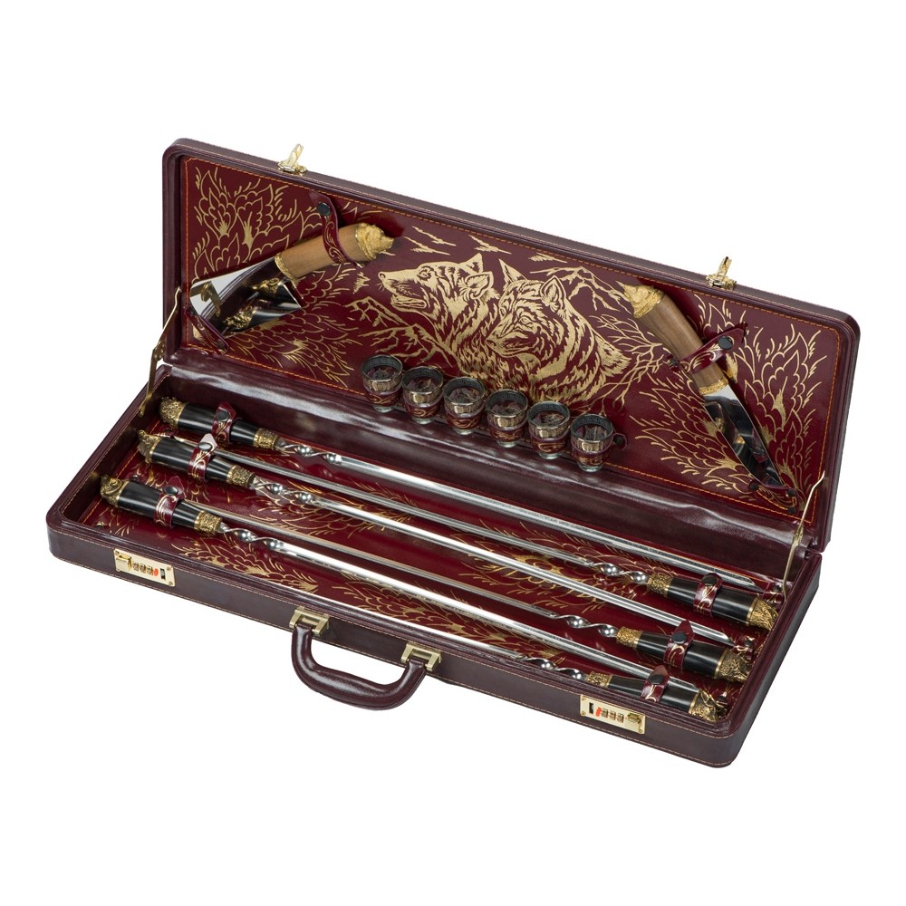 - Шампура (нерж.сталь 3,5 х 2,5 х 67 см), рукоять орех с бронзовым литьем – 6 шт.