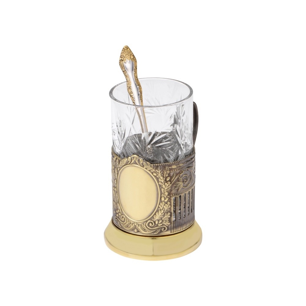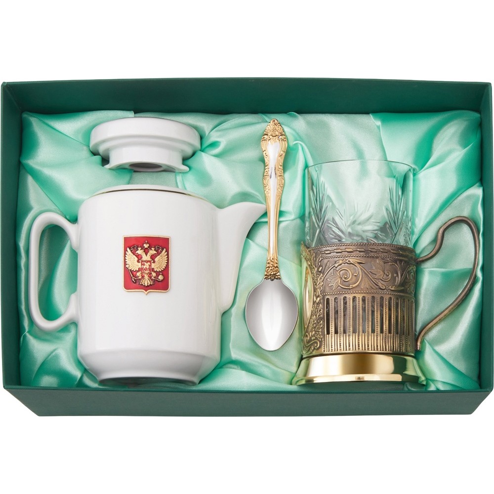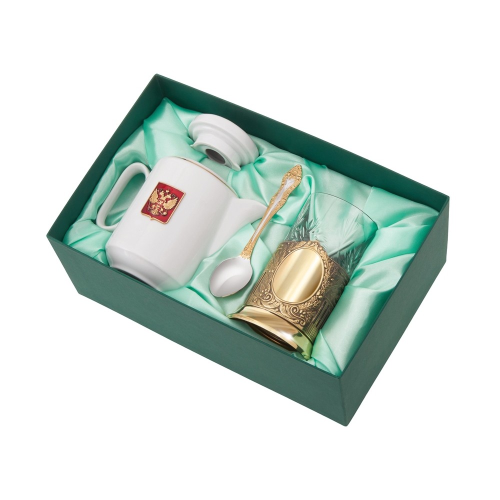 Чайный набор «ЭГОИСТ» - это идеальный подарок для ценителей русской культуры. Набор состоит из золотистого подстаканника, хрустального стакана, ложки и фарфорового чайника. Чайный набор совмещает в себе практическую пользу и традиционную эстетику.