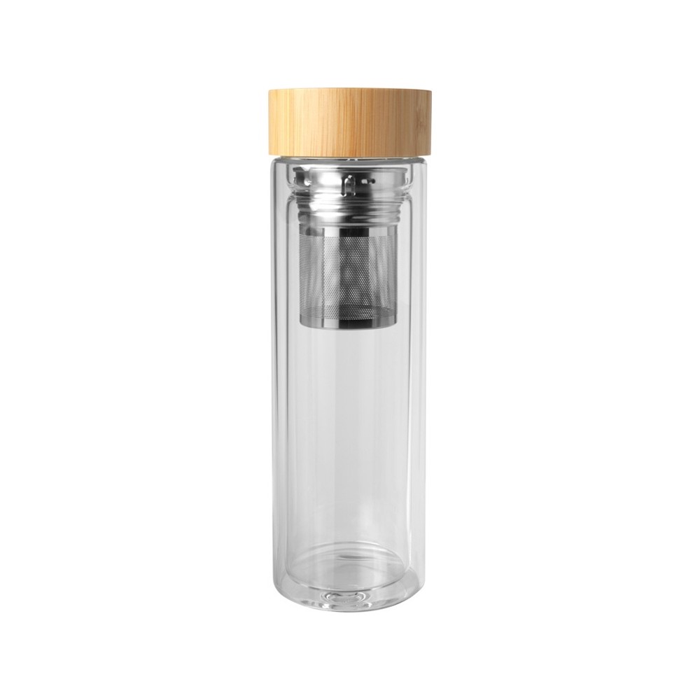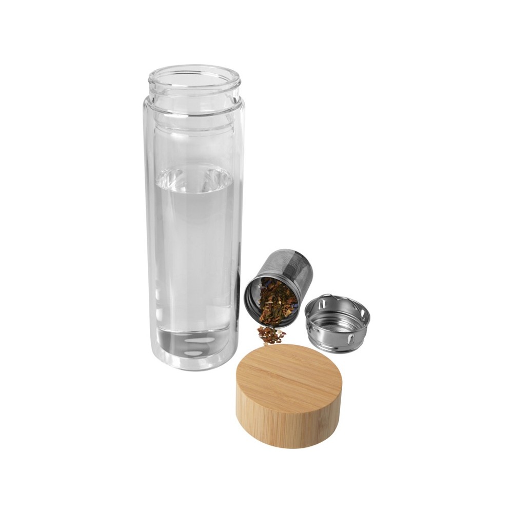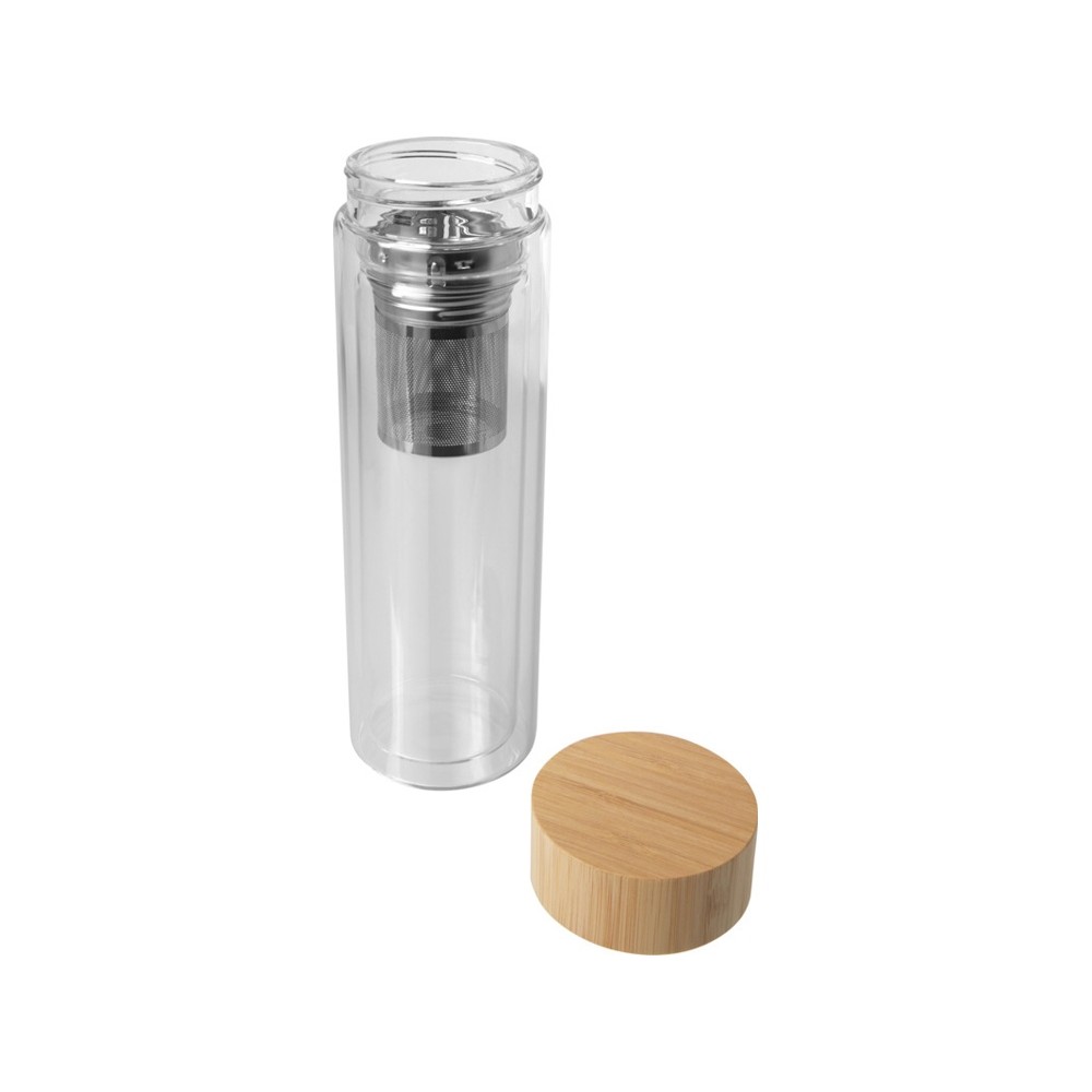 Бутылка для воды из боросиликатного стекла с двойными стенками, заварником для чая и бамбуковой крышкой. Используемый бамбук поступает из устойчивых, экологически чистых и социально ответственных источников. Объем: 400 мл. Поставляется в коробке из переработанного картона. Borosilicate glass.