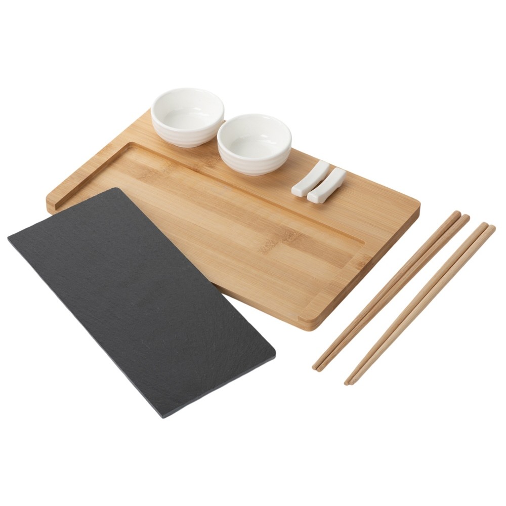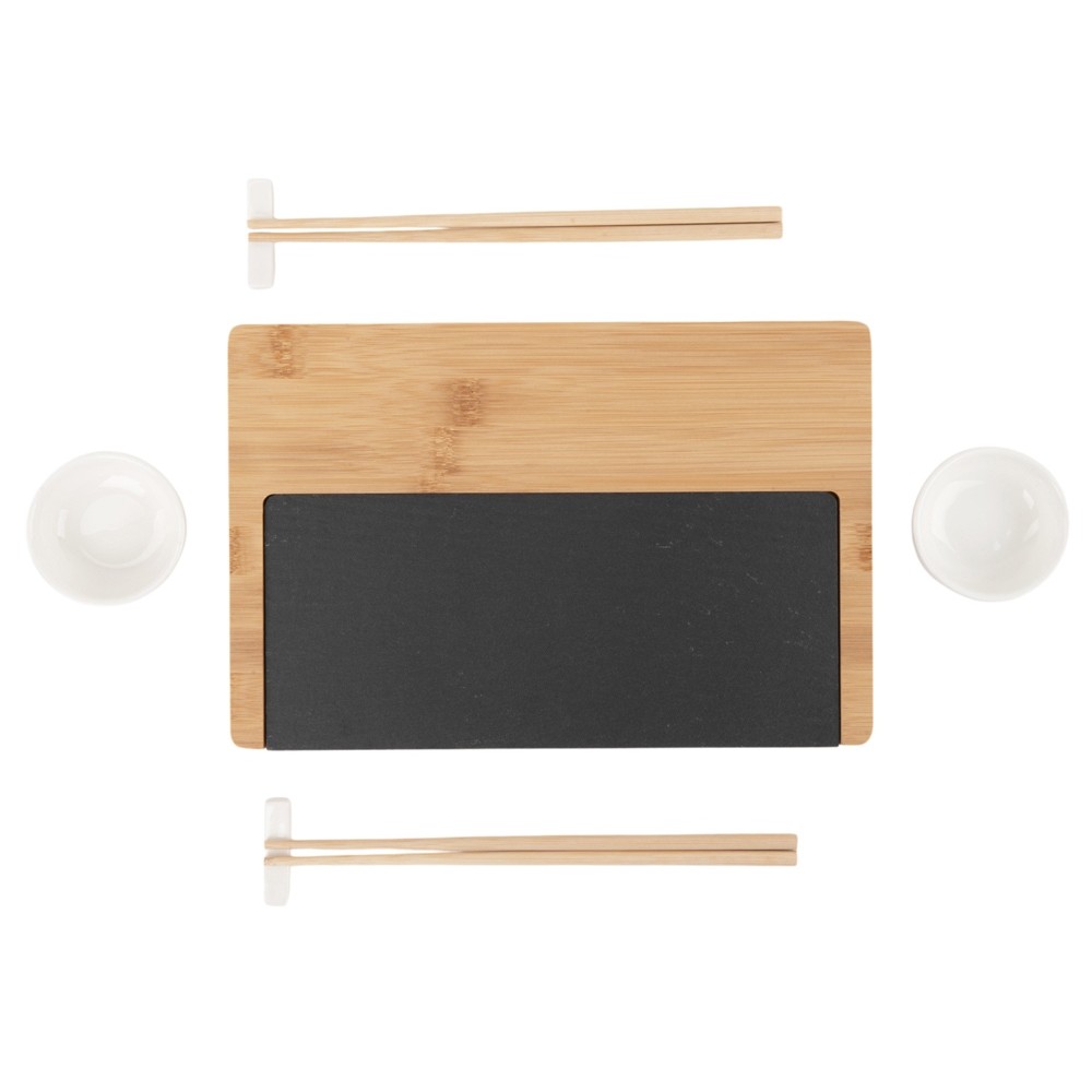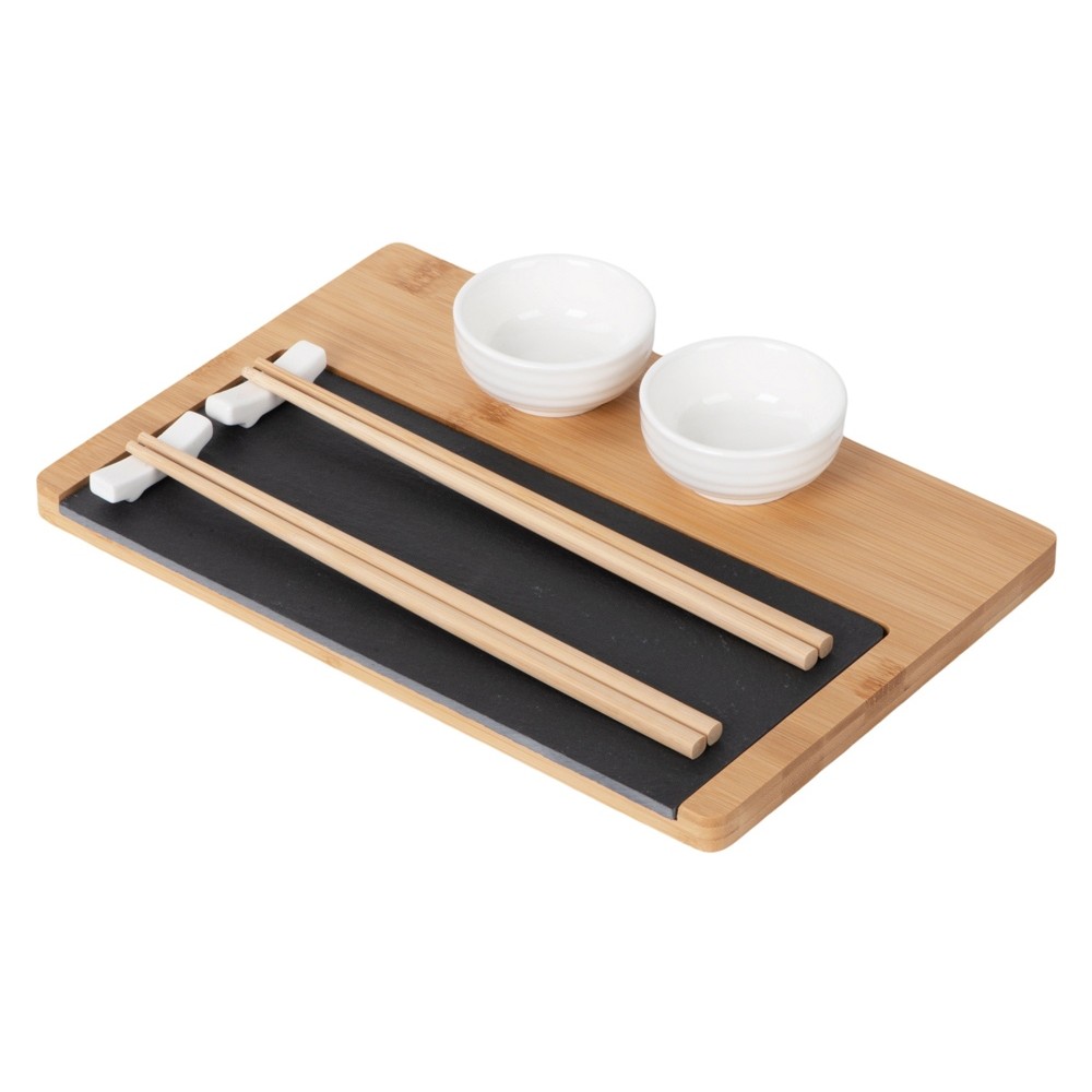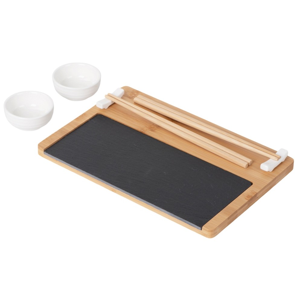 Комплектность подставка из бамбука и сланца, керамическая соусница 2 шт., набор палочек для суши 2 шт., подставки для палочек 2 шт.
