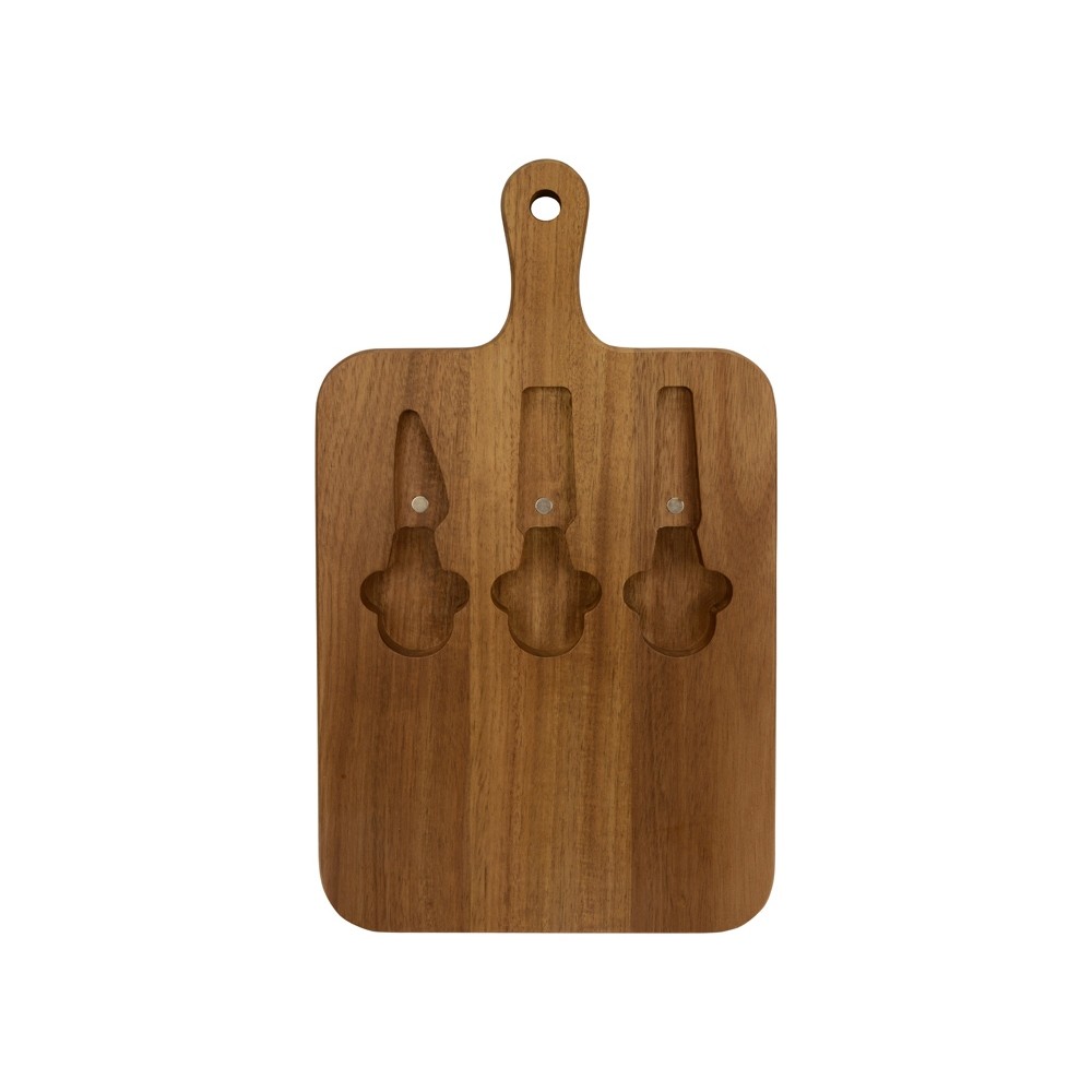 Комплектность разделочная доска 21,5 х 37,3 х 2 см, нож листовидный 11,2 см, нож-лопатка для мягкого сыра 12,2 см, вилка 12,3 см