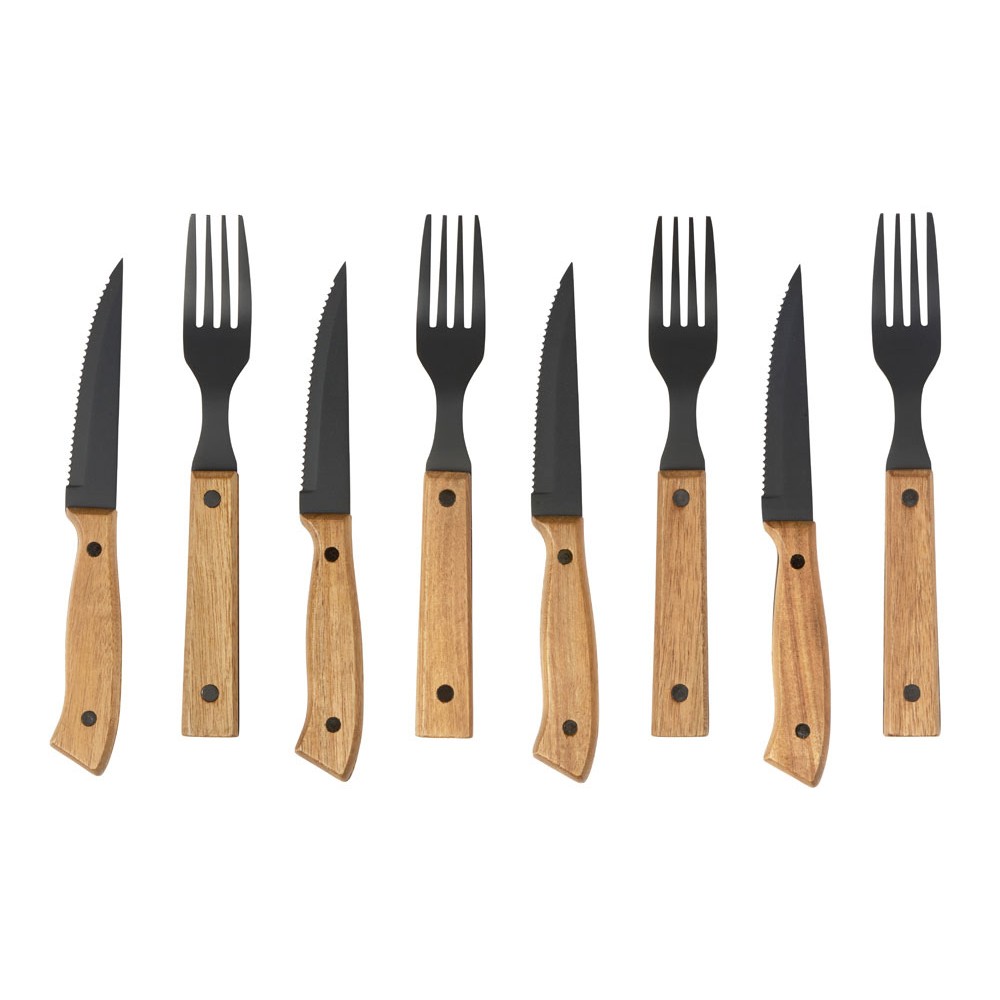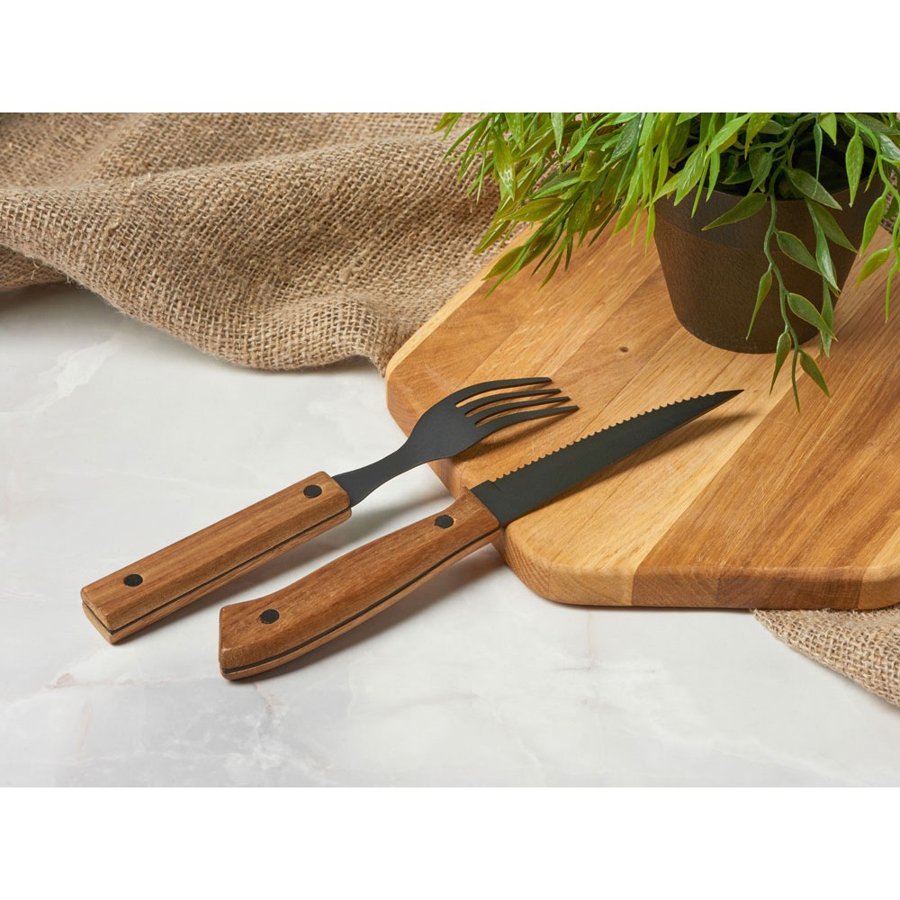Набор приборов для стейка от бренда Tour de Grass выполнен из нержавеющей стали, обеспечивающей качество вилок и ножей в комплекте, а ручки приборов — из акации, которая также славится своей прочностью и долговечностью и точно не даст обжечься. Древесина акации устойчива к растрескиванию и не боится контактов с пищей.