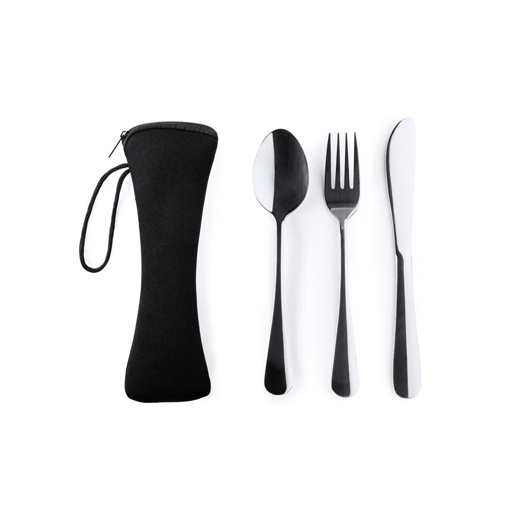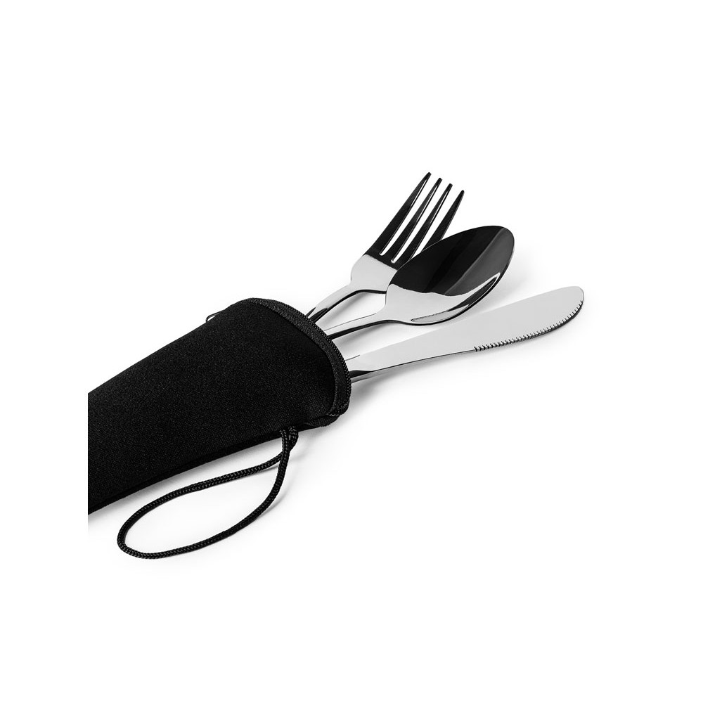 Набор столовых приборов из нержавеющей стали в практичном неопреновом футляре. Включает в себя вилку, нож и ложку, идеально подходящие для того, чтобы брать их с собой куда угодно.