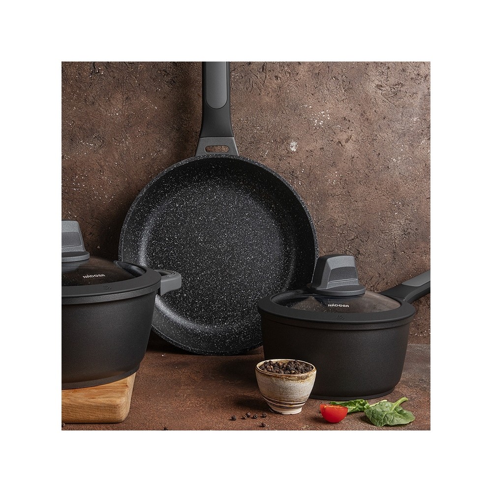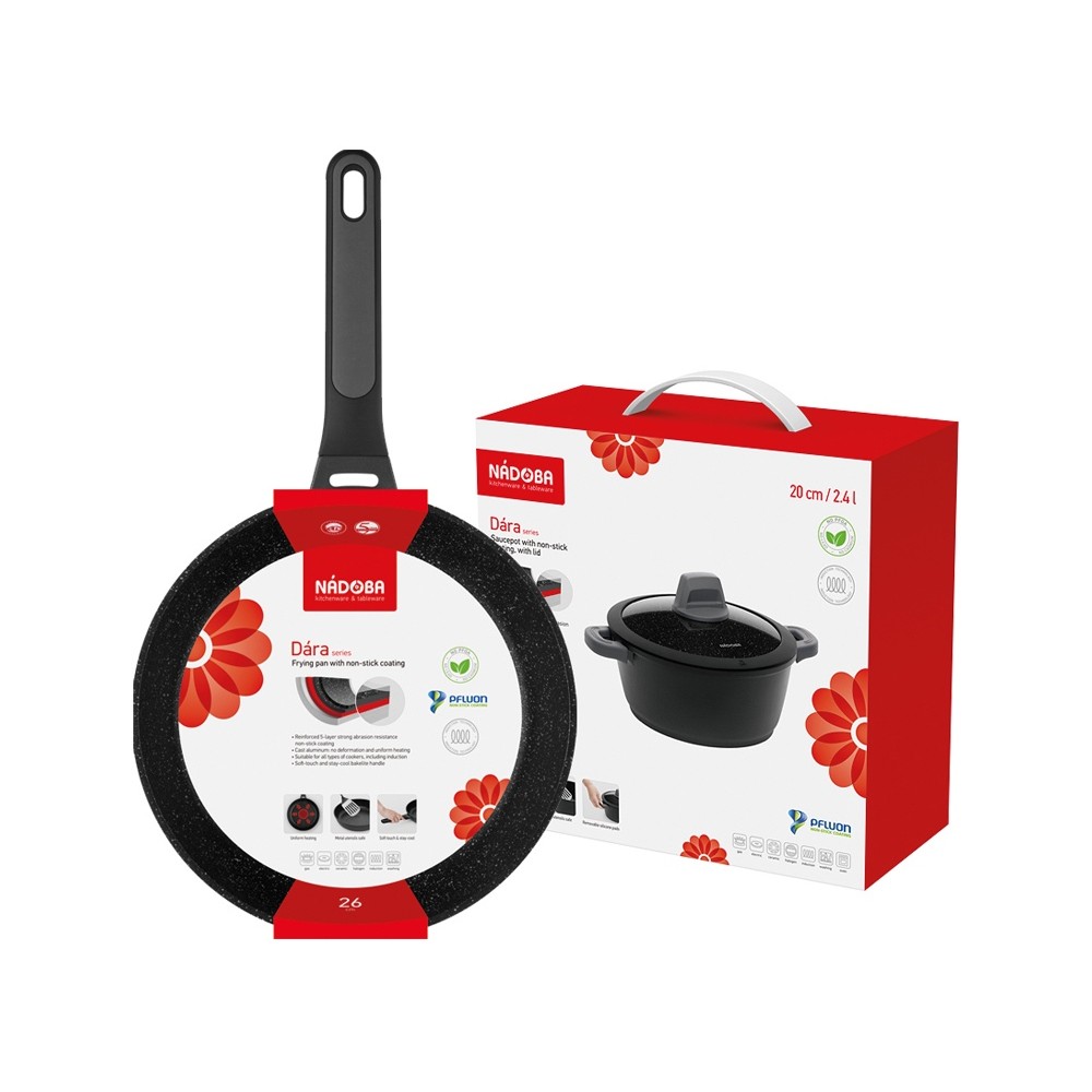 Продукция серии Dara изготовлена из литого алюминия с использованием особо прочного 5-слойного антипригарного покрытия Pfluon, обладающего прекрасными антипригарными свойствами, прочностью и износостойкостью, благодаря чему посуда подходит для ежедневного использования и будет служить не один год. В серию NADOBA Dara входят сковороды 20, 24, 26, 28 см, глубокая, блинная, кастрюля, ковш и сотейник.