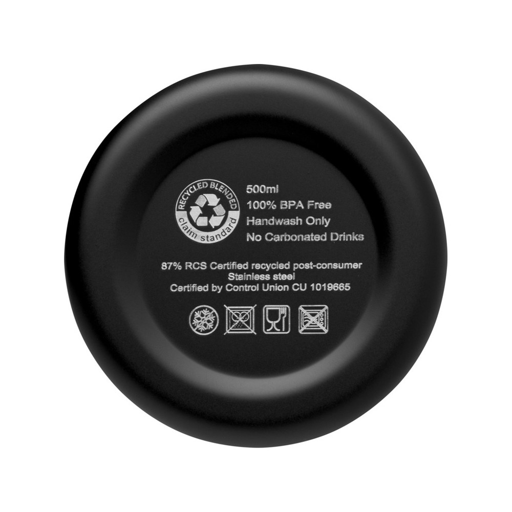 Бутылка из нержавеющей стали, сертифицированная RCS, с медной вакуумной изоляцией и лаконичным дизайном. Изолированная конструкция из нержавеющей стали предотвращает образование конденсата внутри бутылки, а модное матовое порошковое покрытие делает бутылку особенно прочной. Не содержит БФА, протестирована и одобрена в соответствии с немецким законодательством о безопасности пищевых продуктов (LFGB). Проверена на содержание фталатов и одобрена для использования в соответствии с правилами REACH. Объем 500 мл. Рекомендуется мыть вручную. Поставляется в подарочной коробке из переработанного картона. Recycled stainless steel.