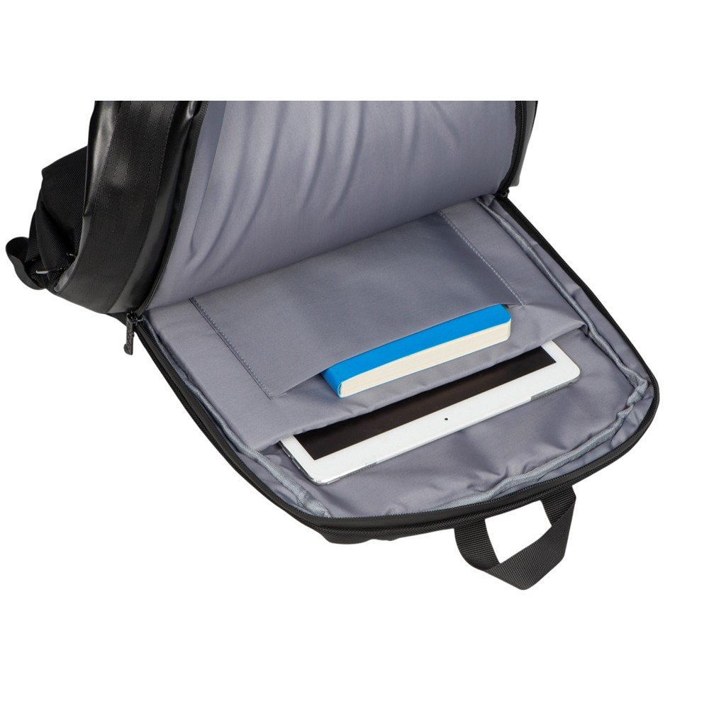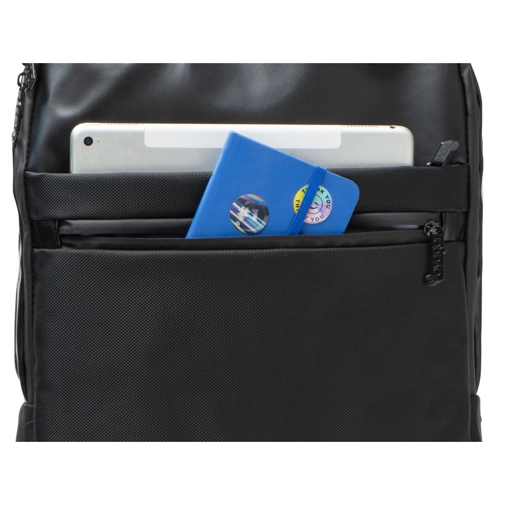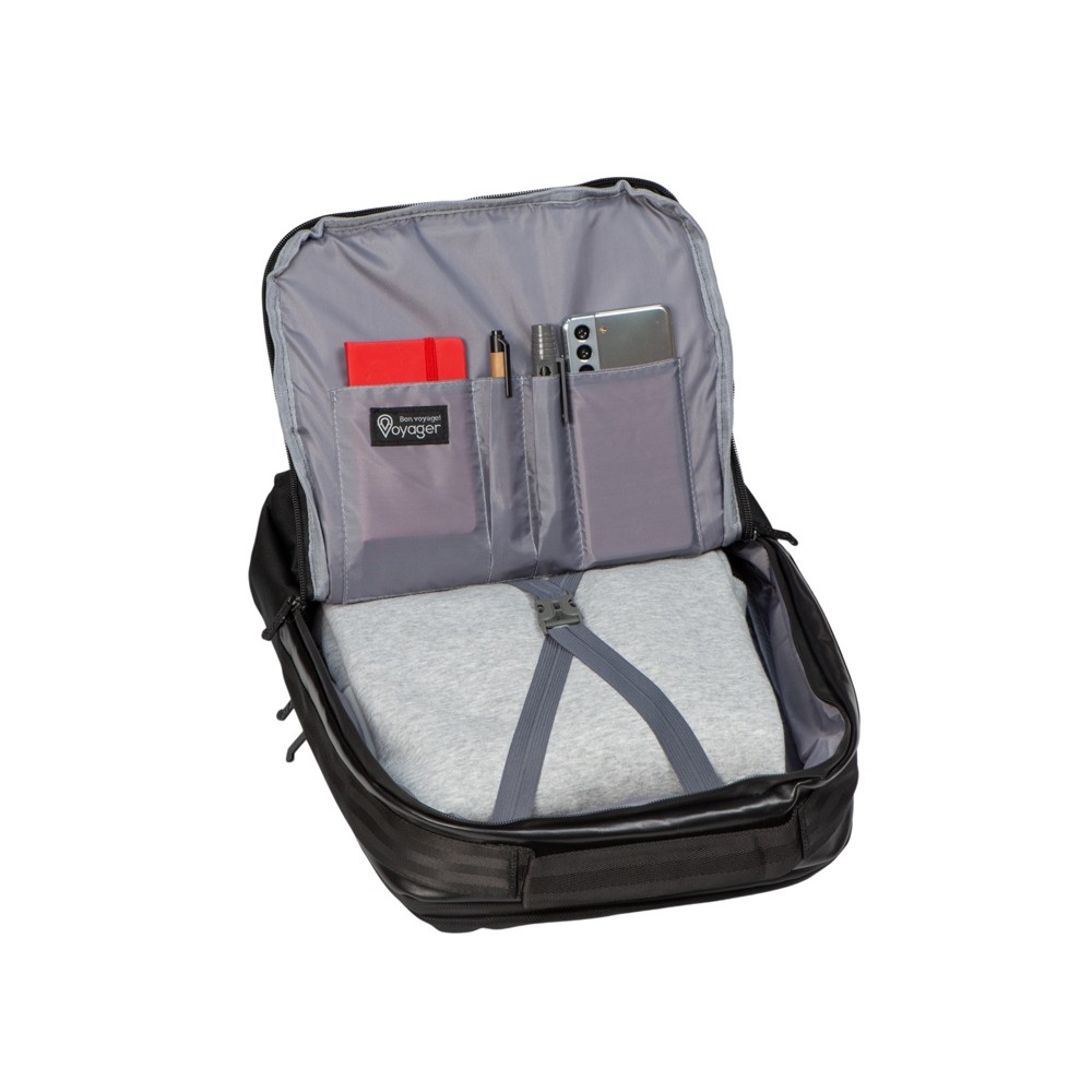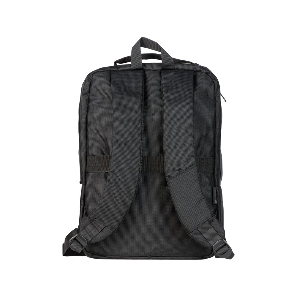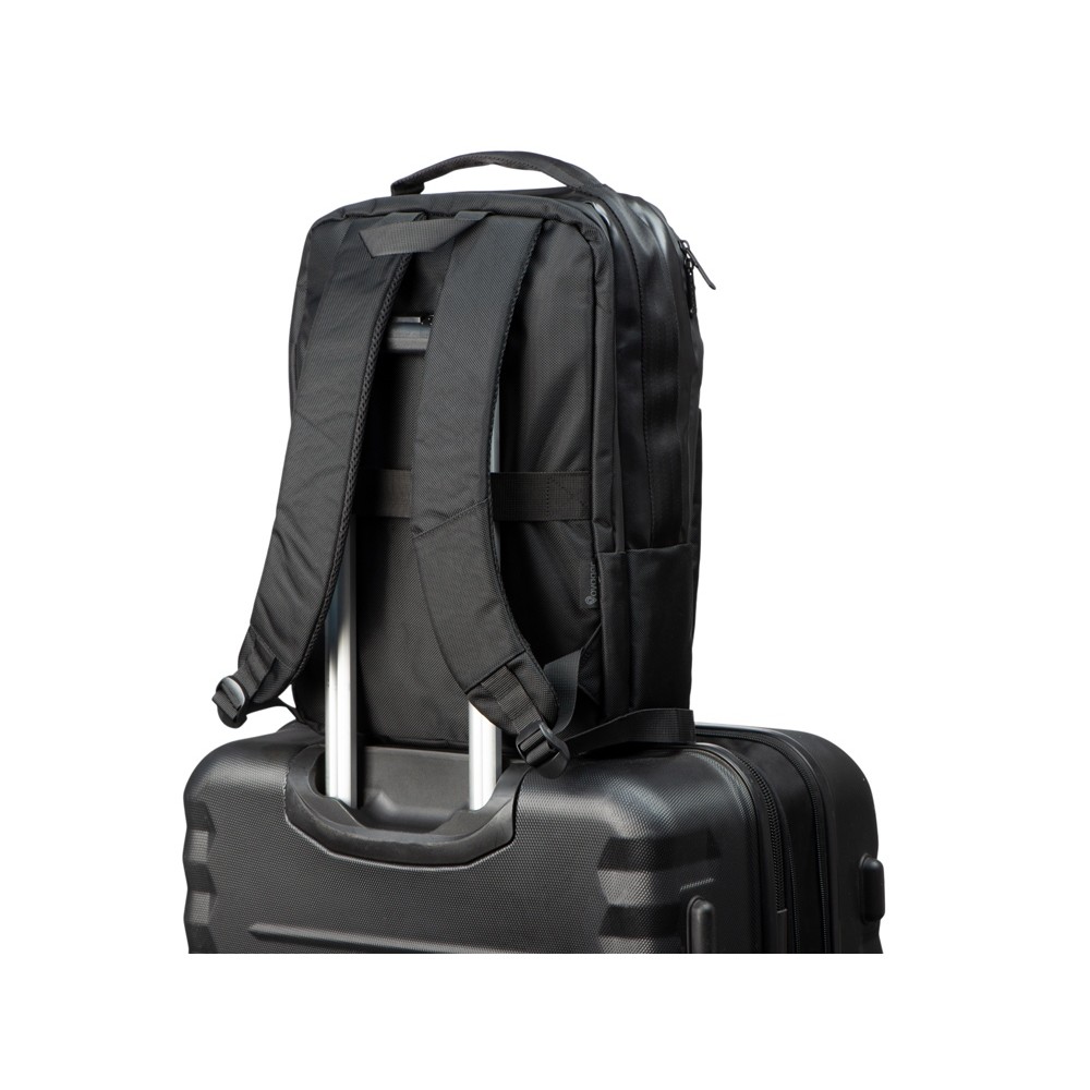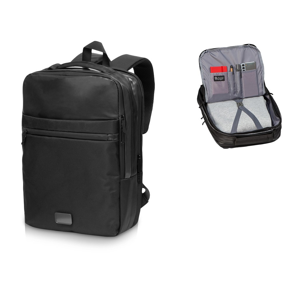 Удобный бизнес-рюкзак для передвижения по городу и деловых поездок состоит из отделения для ноутбука и планшета, большого отделения для одежды с фиксирующими ремнями, 2х наружных карманов на молнии спереди. Конструкция рюкзака продумана до мелочей: внутри большого отделения расположен органайзер для гаджетов и проводов, на спинке есть ремень для крепления на ручку чемодана и регулирующиеся по длине лямки, на лямке - карман для карт или ключей. Водостойкий материал и молнии. В комплекте мешок из спанбонда для хранения и металлический шильд под ваш логотип.