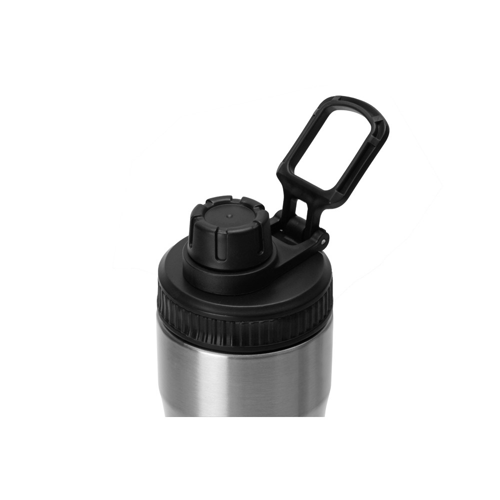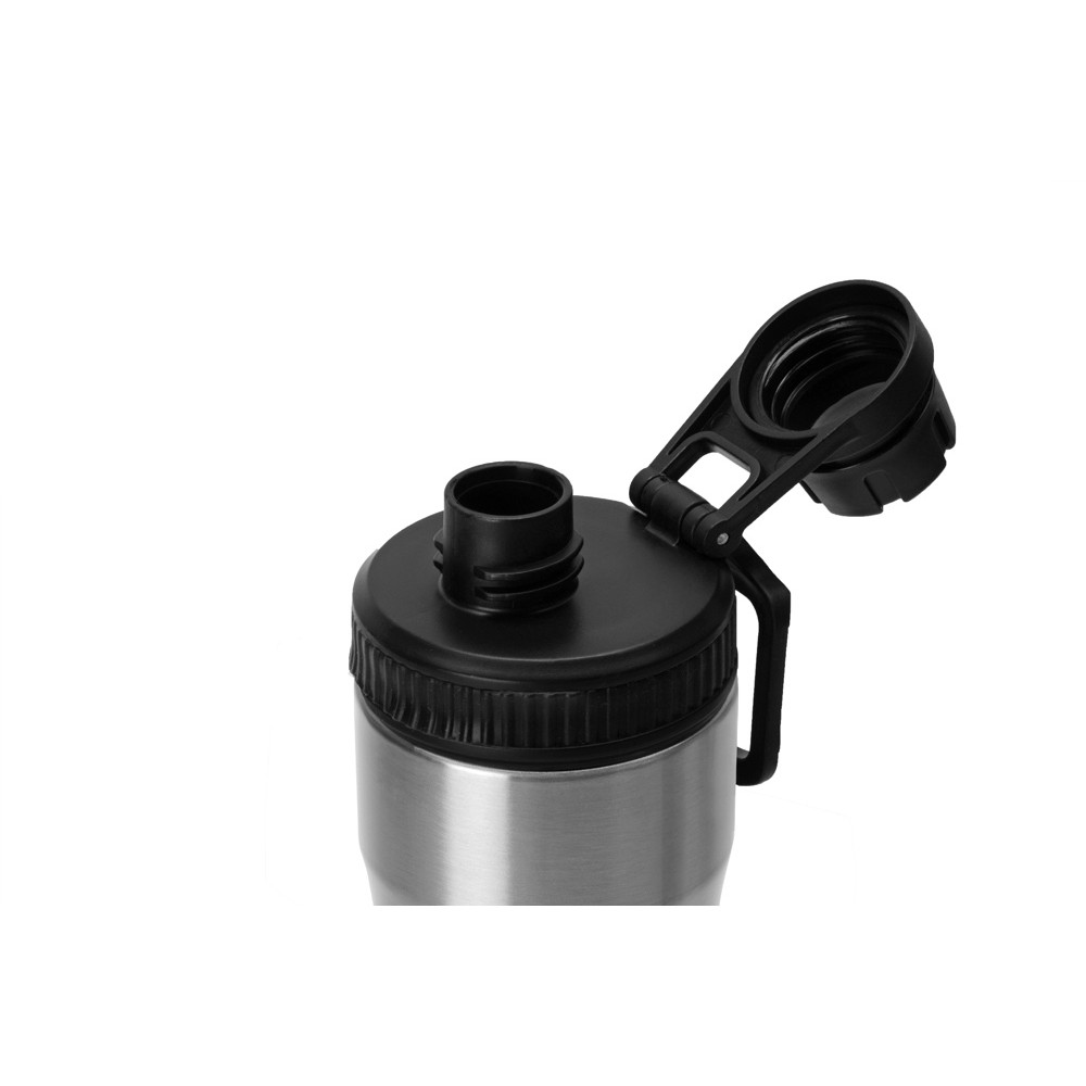 Крышка оснащена складной ручкой-держалкой, которая может быть использована для подвешивания или переноски, а также нетеряемым колпачком. Широкое питьевое отверстие позволяет быстро утолить жажду во время занятий спортом. Рельефное силиконовое кольцо по краю крышки поможет вам быстро и легко отвинтить ее от бутылки.