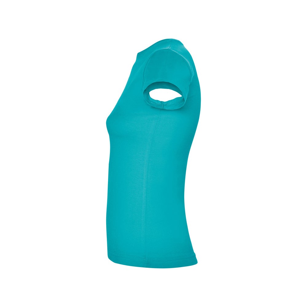 Приталенная женская футболка с боковыми швами и круглым вырезом горловины, двухслойный риб 1х1. Широкая цветовая палитра.