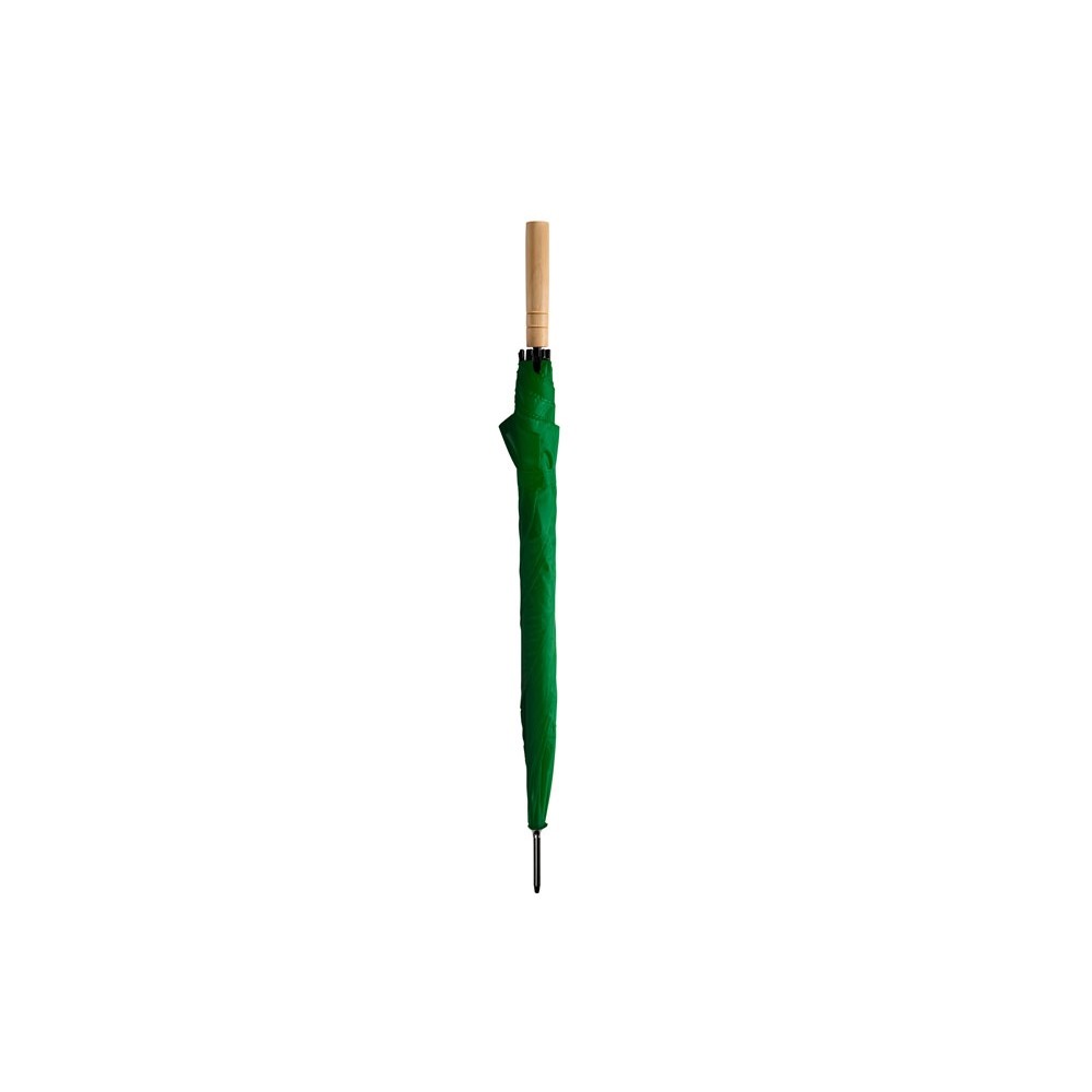 Зонт с деревянной ручкой и автоматическим открытием. Спицы и отделка черного цвета. Застежка на липучке.