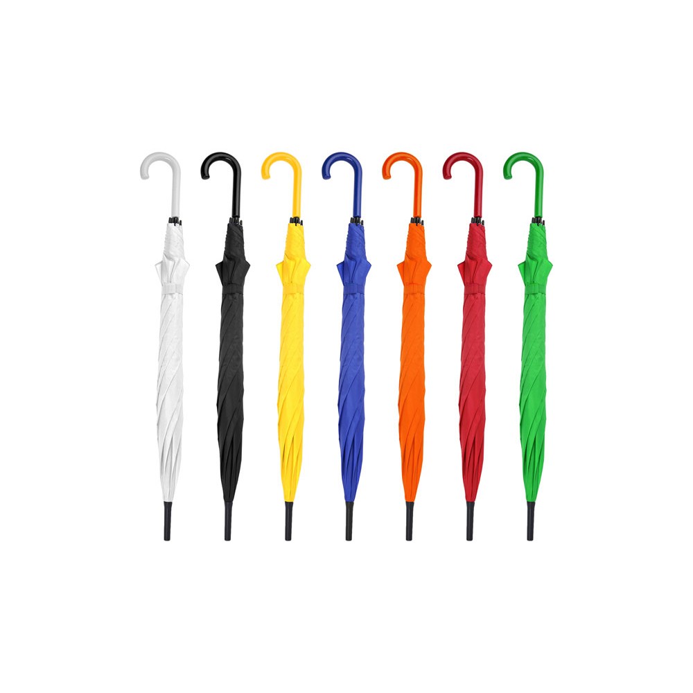 Автоматический зонт с тканью и ручкой в тон. Спицы и наконечники черного цвета. Застежка на липучке. 105 см в диаметре.