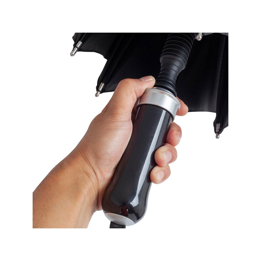 Удобный автоматически открывающийся зонт-трость с уникальной функцией быстрого открытия - нужно потянуть вниз металлическое кольцо на ручке. Купол зонта изготовлен из эпонжа из переработанного пластика, с использованием технологии WaterSAVE, когда окрашивание материала происходит в процессе производства, за счет чего снижает потребление электроэнергии и воды. Высококачественная система защиты от ветра в штормовых условиях обеспечивается гибкими спицами из стекловолокна. Ручка глянцево-черного цвета с хромированными вставками и петлей для переноски. В комплекте чехол, застегивающийся на кнопку.